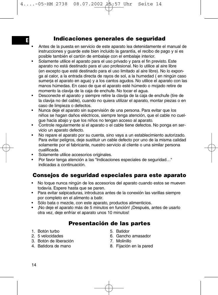 1. Asegúrese, que el interruptor de velocidad (2) esté en posición “0/AUS”. 2. Conecte el aparato a una caja de enchufe 230 V, 50 HZ instalada por la norma. 3. Sumerja el gancho amasador y batidor en el alimento a batir. Ajuste la velocidad deseada con el interruptor de velocidad (2). 1. Brazo triturador: mantequilla, patatas, masa ligera 2. Brazos batidores: salsa, productos lácteos, etc., postres, flan, clara de huevo batida, nata 3. Molinillo: salsas para ensaladas, masas ligeras de crepe, pesto 4. Mueva el aparato al mismo tiempo ligeramente de arriba hacia abajo. Observación: Para los mejores resultados, utilize recipientes que no estén demasido grandes y que tengan bordes altos. Tecla turbo (1) Para una utilización corta a alta velocidad. Apriete la tecla por intermitencias para obtener un funcionamiento Pulso. CUIDADO: Sólo utilize esta función 3 minutos máximo! Liberar gancho amasador / batidor Para liberar los ganchos, presione el botón de liberación (3). 15