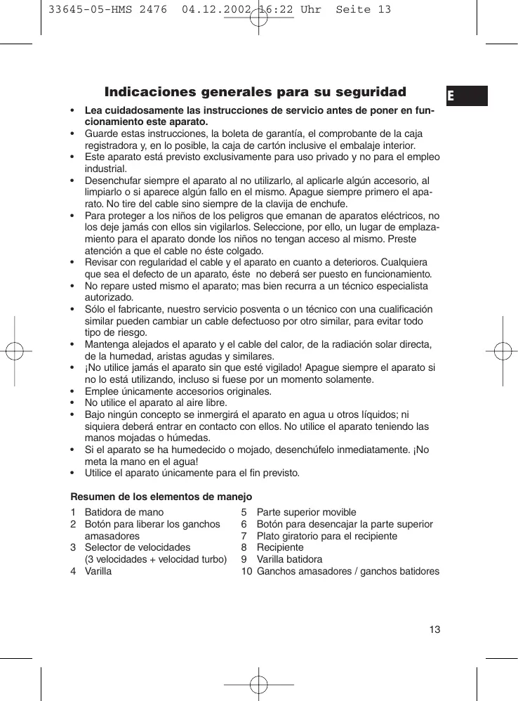 Lea cuidadosamente las instrucciones de servicio antes de poner en funcionamiento este aparato. Guarde estas instrucciones, la boleta de garantía, el comprobante de la caja registradora y, en lo posible, la caja de cartón inclusive el embalaje interior. Este aparato está previsto exclusivamente para uso privado y no para el empleo industrial. Desenchufar siempre el aparato al no utilizarlo, al aplicarle algún accesorio, al limpiarlo o si aparece algún fallo en el mismo. Apague siempre primero el aparato. No tire del cable sino siempre de la clavija de enchufe. Para proteger a los niños de los peligros que emanan de aparatos eléctricos, no los deje jamás con ellos sin vigilarlos. Seleccione, por ello, un lugar de emplazamiento para el aparato donde los niños no tengan acceso al mismo. Preste atención a que el cable no éste colgado. Revisar con regularidad el cable y el aparato en cuanto a deterioros. Cualquiera que sea el defecto de un aparato, éste no deberá ser puesto en funcionamiento. No repare usted mismo el aparato; mas bien recurra a un técnico especialista autorizado. Sólo el fabricante, nuestro servicio posventa o un técnico con una cualificación similar pueden cambiar un cable defectuoso por otro similar, para evitar todo tipo de riesgo. Mantenga alejados el aparato y el cable del calor, de la radiación solar directa, de la humedad, aristas agudas y similares. ¡No utilice jamás el aparato sin que esté vigilado! Apague siempre el aparato si no lo está utilizando, incluso si fuese por un momento solamente. Emplee únicamente accesorios originales. No utilice el aparato al aire libre. Bajo ningún concepto se inmergirá el aparato en agua u otros líquidos; ni siquiera deberá entrar en contacto con ellos. No utilice el aparato teniendo las manos mojadas o húmedas. Si el aparato se ha humedecido o mojado, desenchúfelo inmediatamente. ¡No meta la mano en el agua! Utilice el aparato únicamente para el fin previsto. Resumen de los elementos de manejo 1 Batidora de mano 2 Botón para liberar los ganchos amasadores 3 Selector de velocidades (3 velocidades + velocidad turbo) 4 Varilla