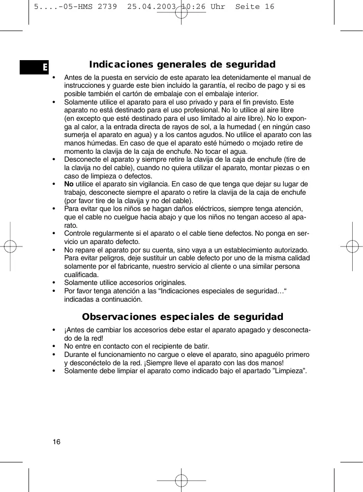 Antes de la puesta en servicio de este aparato lea detenidamente el manual de instrucciones y guarde este bien incluido la garantía, el recibo de pago y si es posible también el cartón de embalaje con el embalaje interior. Solamente utilice el aparato para el uso privado y para el fin previsto. Este aparato no está destinado para el uso profesional. No lo utilice al aire libre (en excepto que esté destinado para el uso limitado al aire libre). No lo exponga al calor, a la entrada directa de rayos de sol, a la humedad ( en ningún caso sumerja el aparato en agua) y a los cantos agudos. No utilice el aparato con las manos húmedas. En caso de que el aparato esté húmedo o mojado retire de momento la clavija de la caja de enchufe. No tocar el agua. Desconecte el aparato y siempre retire la clavija de la caja de enchufe (tire de la clavija no del cable), cuando no quiera utilizar el aparato, montar piezas o en caso de limpieza o defectos. No utilice el aparato sin vigilancia. En caso de que tenga que dejar su lugar de trabajo, desconecte siempre el aparato o retire la clavija de la caja de enchufe (por favor tire de la clavija y no del cable). Para evitar que los niños se hagan daños eléctricos, siempre tenga atención, que el cable no cuelgue hacia abajo y que los niños no tengan acceso al aparato. Controle regularmente si el aparato o el cable tiene defectos. No ponga en servicio un aparato defecto. No repare el aparato por su cuenta, sino vaya a un establecimiento autorizado. Para evitar peligros, deje sustituir un cable defecto por uno de la misma calidad solamente por el fabricante, nuestro servicio al cliente o una similar persona cualificada. Solamente utilice accesorios originales. Por favor tenga atención a las “Indicaciones especiales de seguridad…“ indicadas a continuación. Observaciones especiales de seguridad
