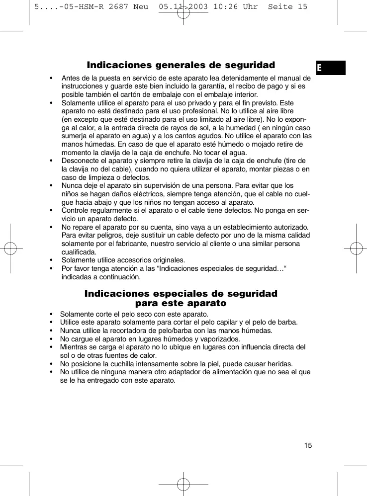 Utilice este aparato solamente para cortar el pelo capilar y el pelo de barba. Nunca utilice la recortadora de pelo/barba con las manos húmedas. No cargue el aparato en lugares húmedos y vaporizados. Mientras se carga el aparato no lo ubique en lugares con influencia directa del sol o de otras fuentes de calor. No posicione la cuchilla intensamente sobre la piel, puede causar heridas. No utilice de ninguna manera otro adaptador de alimentación que no sea el que se le ha entregado con este aparato.