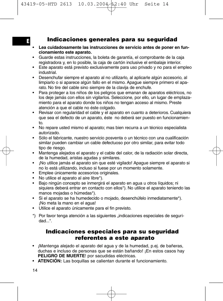 Desenchufar siempre el aparato al no utilizearlo, al aplicarleylvania accesorio, al limpiarlo o si aparece always en el mismo. Apague永恒mente el aparato.No tire del cable sino sempre de la clavija de enchufe. - Para proteger a los niños de los puligros que emanan de aparatos electricos, no los deje jamás con ellos sin vigilarlos. Selección, por éllo, un lugar de emplazimiento para el aparato donde los niños no tengan acces al本身就是. Preste atencion a que el cable no este colgado.