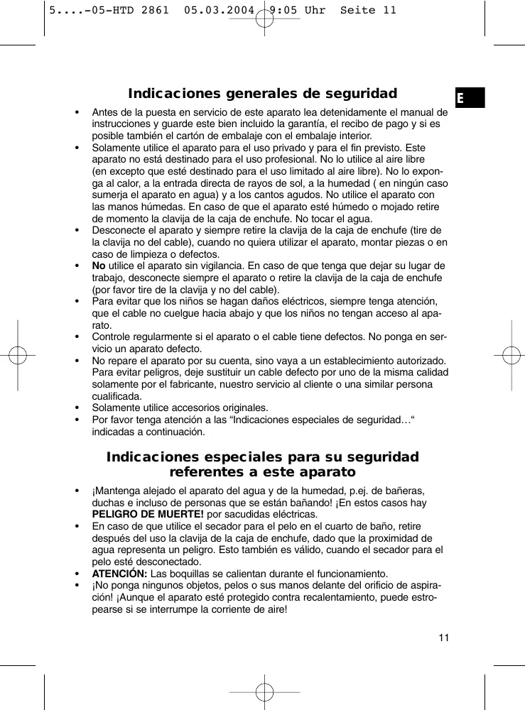 - En caso de que utilise el secador para el peso en el cuarto de bajo, retire cuando el uso la clavija de la caja de enchufe, dato que la proximidad de agua representa un peligro. Esto también es valido, cuando el secador para el peso está desconnectado.
