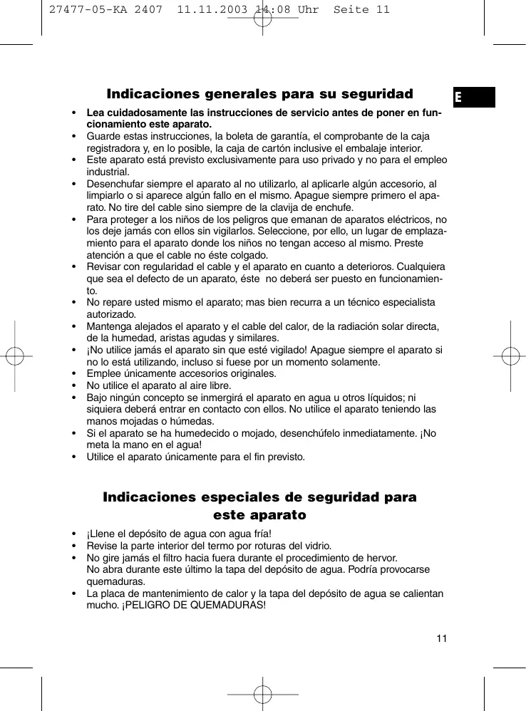 Guarde estas instrucciones, la boleta de garantía, el comprobante de la caja registradora y, en lo posible, la caja de cartón inclusive el embalaje interior. Este aparato está previsto exclusivamente para uso privado y no para el empleo industrial. Desenchufar siempre el aparato al no utilizarlo, al aplicarle algún accesorio, al limpiarlo o si aparece algún fallo en el mismo. Apague siempre primero el aparato. No tire del cable sino siempre de la clavija de enchufe. Para proteger a los niños de los peligros que emanan de aparatos eléctricos, no los deje jamás con ellos sin vigilarlos. Seleccione, por ello, un lugar de emplazamiento para el aparato donde los niños no tengan acceso al mismo. Preste atención a que el cable no éste colgado. Revisar con regularidad el cable y el aparato en cuanto a deterioros. Cualquiera que sea el defecto de un aparato, éste no deberá ser puesto en funcionamiento. No repare usted mismo el aparato; mas bien recurra a un técnico especialista autorizado. Mantenga alejados el aparato y el cable del calor, de la radiación solar directa, de la humedad, aristas agudas y similares. ¡No utilice jamás el aparato sin que esté vigilado! Apague siempre el aparato si no lo está utilizando, incluso si fuese por un momento solamente. Emplee únicamente accesorios originales. No utilice el aparato al aire libre. Bajo ningún concepto se inmergirá el aparato en agua u otros líquidos; ni siquiera deberá entrar en contacto con ellos. No utilice el aparato teniendo las manos mojadas o húmedas. Si el aparato se ha humedecido o mojado, desenchúfelo inmediatamente. ¡No meta la mano en el agua! Utilice el aparato únicamente para el fin previsto.