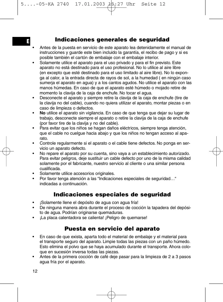 Solamente utilice el aparato para el uso privado y para el fin previsto. Este aparato no está destinado para el uso profesional. No lo utilice al aire libre (en excepto que esté destinado para el uso limitado al aire libre). No lo exponga al calor, a la entrada directa de rayos de sol, a la humedad ( en ningún caso sumerja el aparato en agua) y a los cantos agudos. No utilice el aparato con las manos húmedas. En caso de que el aparato esté húmedo o mojado retire de momento la clavija de la caja de enchufe. No tocar el agua. Desconecte el aparato y siempre retire la clavija de la caja de enchufe (tire de la clavija no del cable), cuando no quiera utilizar el aparato, montar piezas o en caso de limpieza o defectos. No utilice el aparato sin vigilancia. En caso de que tenga que dejar su lugar de trabajo, desconecte siempre el aparato o retire la clavija de la caja de enchufe (por favor tire de la clavija y no del cable). Para evitar que los niños se hagan daños eléctricos, siempre tenga atención, que el cable no cuelgue hacia abajo y que los niños no tengan acceso al aparato. Controle regularmente si el aparato o el cable tiene defectos. No ponga en servicio un aparato defecto. No repare el aparato por su cuenta, sino vaya a un establecimiento autorizado. Para evitar peligros, deje sustituir un cable defecto por uno de la misma calidad solamente por el fabricante, nuestro servicio al cliente o una similar persona cualificada. Solamente utilice accesorios originales. Por favor tenga atención a las “Indicaciones especiales de seguridad…“ indicadas a continuación.