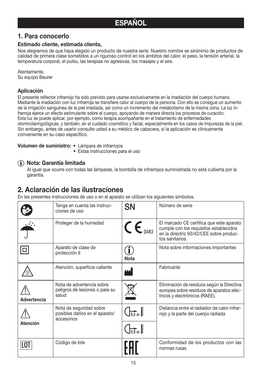 Notas relativas a la seguridad Advertencia • El presente reflector infrarrojo ha sido previsto para usarse exclusivamente en la irradiación del cuerpo humano. • Antes de su uso es preciso asegurarse de que el aparato y sus accesorios no presentan daños visibles y que se ha eliminado toda clase de material de embalaje. En caso de duda se recomienda no utilizarla y consultar a su distribuidor o contactar con el servicio de asistencia técnica en la dirección indicada. • El aparato siempre deberá estar colocado en un sitio seguro y plano. • La carcasa de la lámpara y el radiador infrarrojo se calientan bastante durante el uso. ¡Existe peligro de quemaduras, si se tocan! Dejar siempre que se enfríe la lámpara, antes de tocarla. • Se debe conservar una distancia mínima de 1,0 m entre el reflector infrarrojo y los objetos inflamables. No cuelgue el aparato en la pared ni en el techo. • El aparato sólo debe conectarse a la tensión de red que se indica en la etiqueta de características. • El aparato no debe sumergirse en agua ni utilizarse en entornos húmedos. • Este aparato no está destinado a ser utilizado por personas (incluyendo niños) con capacidad físicas, sensoriales o mentales limitadas, o que carezcan de la experiencia y conocimiento necesario, salvo que estén supervisadas por una persona responsable de su seguridad o que recibiesen instrucciones de la misma en cuanto al uso del aparato. Se debe vigilar que los niños no jueguen con el aparato. • No se debe utilizar en personas insensibles al calor. La sensibilidad al calor puede estar restringida o aumentada en los siguientes casos: – en personas que padecen de diabetes – en personas que padecen de somnolencia, demencia o trastornos de la capacidad de concentración – en personas que presentan en la parte a irradiar alteraciones patológicas de la piel o bien regiones de la piel con cicatrices – en personas que padecen de alergias – en niños y ancianos – después de la toma de medicamentos o alcohol • Si se trata de procesos flemáticos agudos, es recomendable consultar a un médico antes de aplicar la irradiación. • Limitar siempre la duración de la irradiación y controlar la reacción de la piel • Ciertos medicamentos, productos cosméticos o alimentos pueden causar, bajo determinadas circunstancias, una reacción hipersensible o alérgica de la piel. En estos casos debe finalizarse inmediatamente la irradiación. • Si el aparato se usa durante mayores períodos de tiempo, es necesario tomar especial cuidado y atención. ¡Nunca dormirse durante la irradiación! • La aplicación demasiado prolongada puede provocar quemaduras de la piel. • No toque ni retire el reflector infrarrojo si el aparato aún se encuentra conectado a la red. • Cuando los niños utilicen el aparato asegúrese de que estén constantemente vigilados, ya que ellos no prevén los peligros que representan los aparatos eléctricos. • El aparato debe utilizarse sólo bajo vigilancia. • Mantenga a los niños alejados del material de embalaje (peligro de asfixia). • El aparato no debe cubrirse ni guardarse en el embalaje cuando esté caliente. • Extraiga siempre el enchufe de la toma de corriente y deje que el aparato se enfríe antes de tocarlo. • El aparato no debe tocarse con las manos mojadas cuando esté conectado a la red; evite las salpicaduras de agua sobre el aparato. El aparato sólo debe encenderse cuando esté completamente seco. • Proteja el aparato de golpes fuertes. • No extraiga el enchufe de la toma de corriente tirando del cable de alimentación. • En caso de defectos o de fallos de funcionamiento, apague inmediatamente el aparato y desenchúfelo de la red eléctrica.