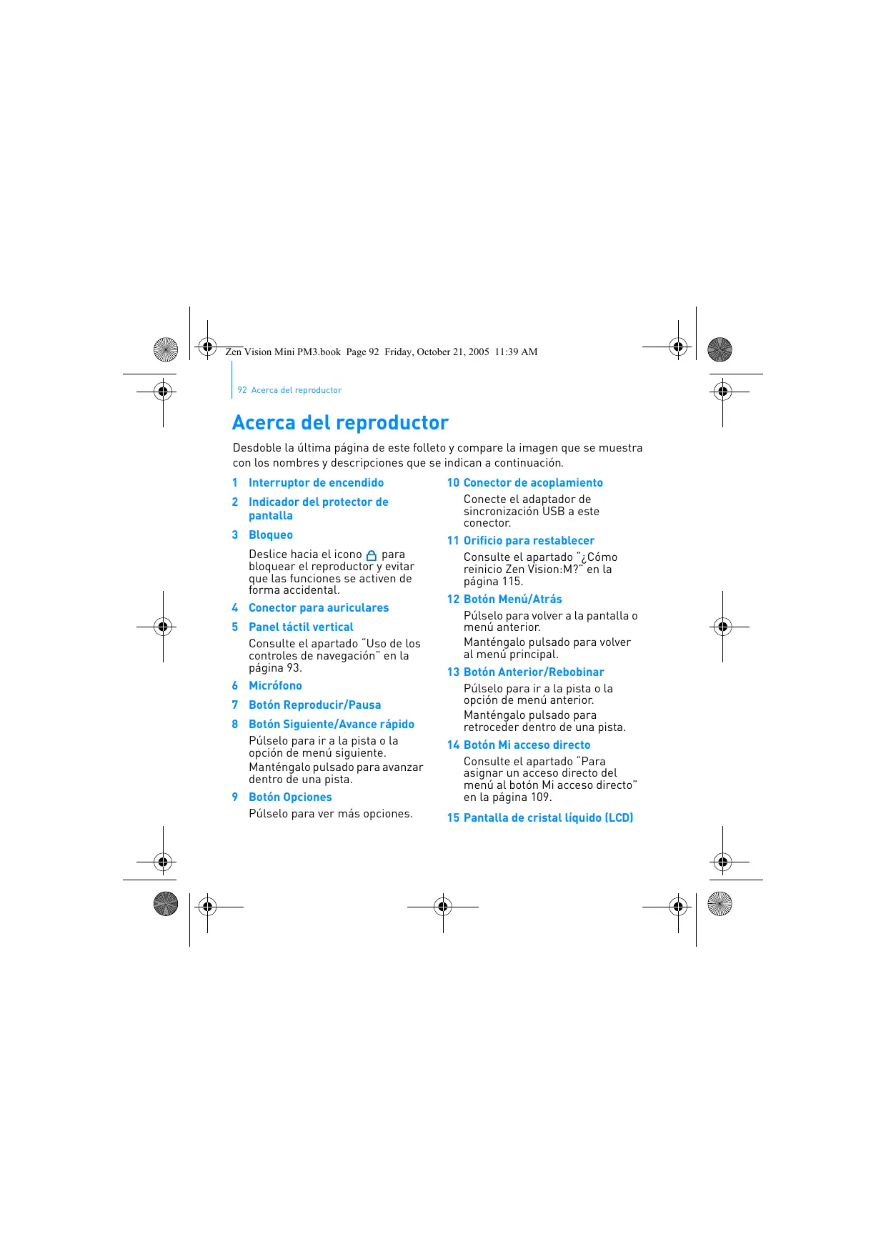 Conecte el adaptador de sincronización USB a este conector. 11 Orificio para restablecer Consulte el apartado “¿Cómo reinicio Zen Vision:M?” en la página 115. 12 Botón Menú/Atrás Púlselo para volver a la pantalla o menú anterior. Manténgalo pulsado para volver al menú principal. 13 Botón Anterior/Rebobinar Púlselo para ir a la pista o la opción de menú anterior. Manténgalo pulsado para retroceder dentro de una pista. 14 Botón Mi acceso directo Consulte el apartado “Para asignar un acceso directo del menú al botón Mi acceso directo” en la página 109. 15 Pantalla de cristal líquido (LCD)