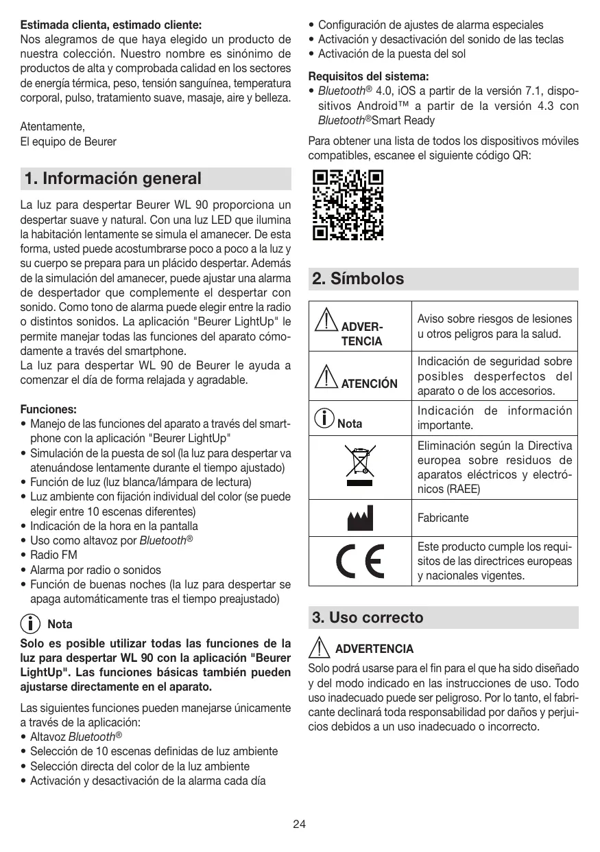 • Manejo de las funciones del aparato a través del smart phone con la aplicación "Beurer LightUp" • Simulación de la puesta de sol (la luz para despertar va atenuándose lentamente durante el tiempo ajustado) • Función de luz (luz blanca/lámpara de lectura) • Luz ambiente con fijación individual del color (se puede elegir entre 10 escenas diferentes) • Indicación de la hora en la pantalla • Uso como altavoz por Bluetooth® • Radio FM • Alarma por radio o sonidos • Función de buenas noches (la luz para despertar se apaga automáticamente tras el tiempo preajustado)