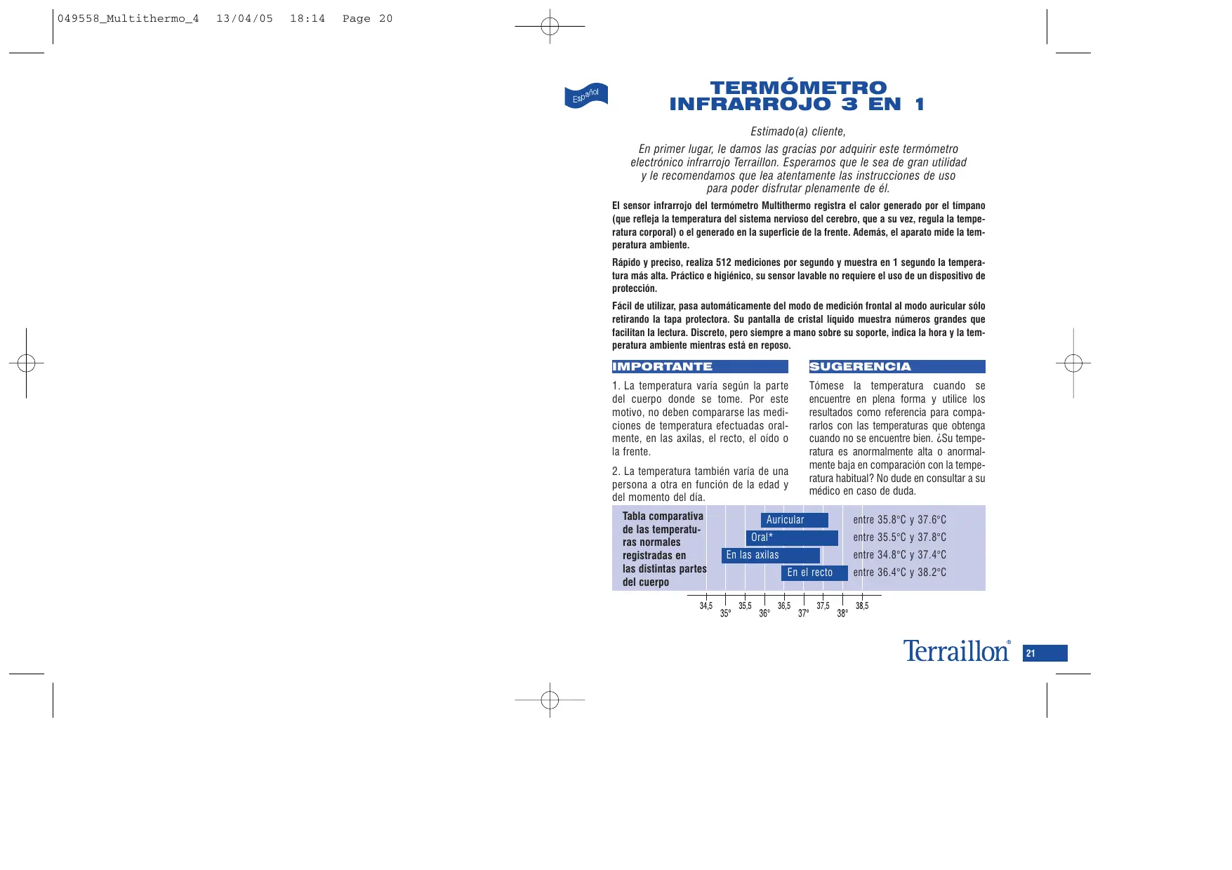 TERMÓMETRO INFRARROJO 3 EN 1 Estimado(a) cliente, En primer lugar, le damos las gracias por adquirir este termómetro electrónico infrarrojo Terraillon. Esperamos que le sea de gran utilidad y le recomendamos que lea atentamente las instrucciones de uso para poder disfrutar plenamente de él. El sensor infrarrojo del termómetro Multithermo registra el calor generado por el tímpano (que refleja la temperatura del sistema nervioso del cerebro, que a su vez, regula la temperatura corporal) o el generado en la superficie de la frente. Además, el aparato mide la temperatura ambiente. Rápido y preciso, realiza 512 mediciones por segundo y muestra en 1 segundo la temperatura más alta. Práctico e higiénico, su sensor lavable no requiere el uso de un dispositivo de protección. Fácil de utilizar, pasa automáticamente del modo de medición frontal al modo auricular sólo retirando la tapa protectora. Su pantalla de cristal líquido muestra números grandes que facilitan la lectura. Discreto, pero siempre a mano sobre su soporte, indica la hora y la temperatura ambiente mientras está en reposo.