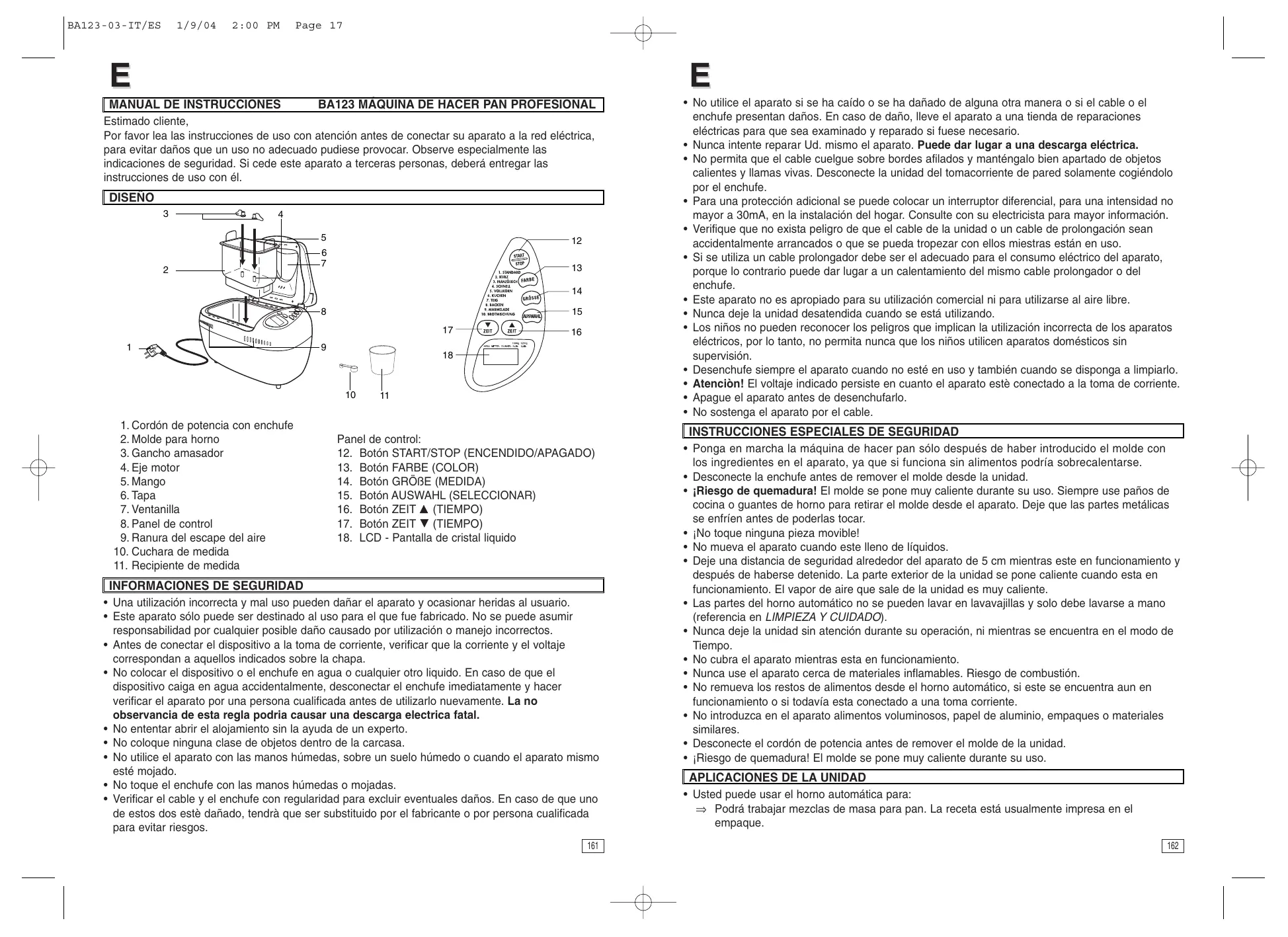 BA123 MÁQUINA DE HACER PAN PROFESIONAL Estimado cliente, Por favor lea las instrucciones de uso con atención antes de conectar su aparato a la red eléctrica, para evitar daños que un uso no adecuado pudiese provocar. Observe especialmente las indicaciones de seguridad. Si cede este aparato a terceras personas, deberá entregar las instrucciones de uso con él. DISEÑO