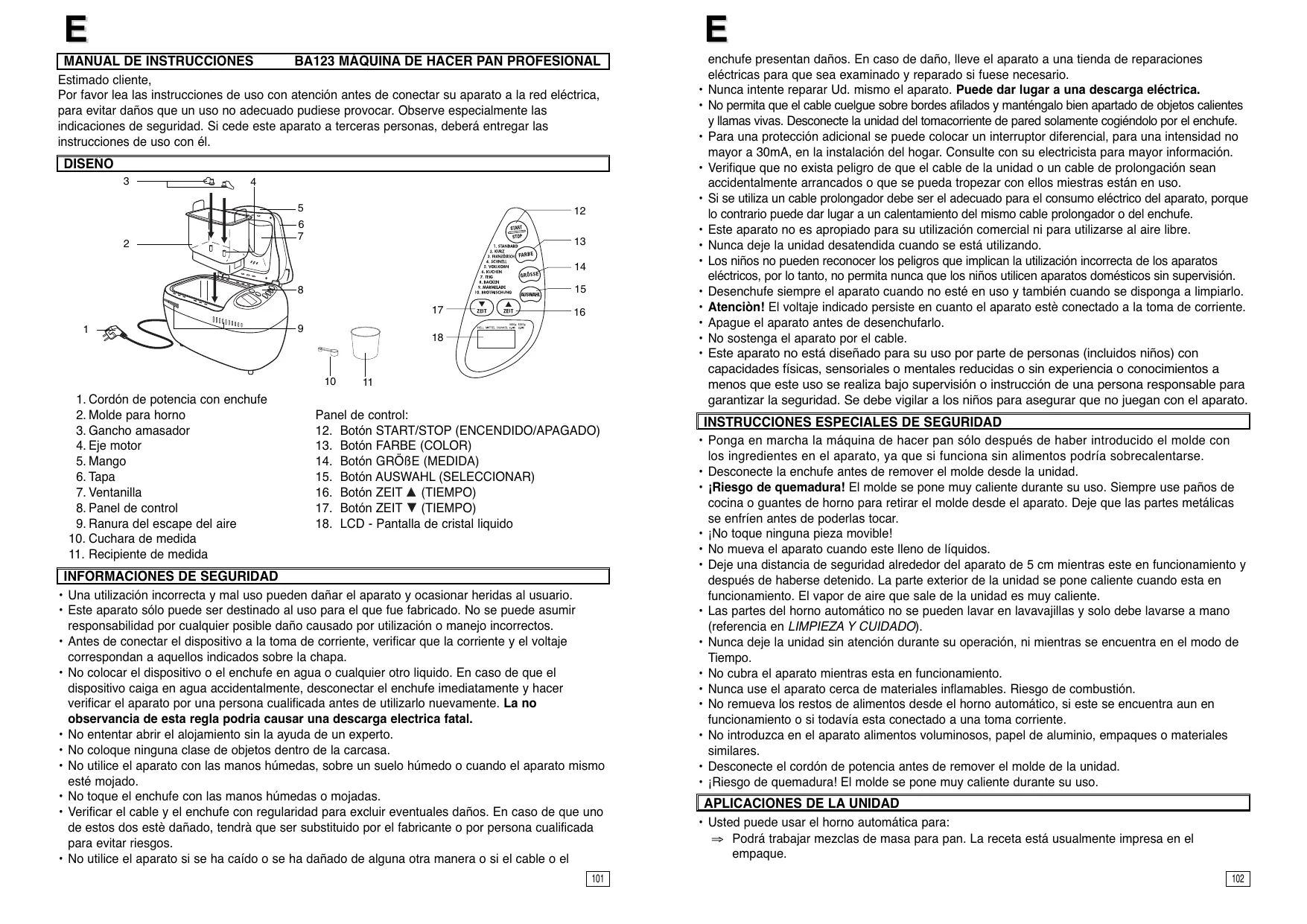 BA123 MÁQUINA DE HACER PAN PROFESIONAL Estimado cliente, Por favor lea las instrucciones de uso con atención antes de conectar su aparato a la red eléctrica, para evitar daños que un uso no adecuado pudiese provocar. Observe especialmente las indicaciones de seguridad. Si cede este aparato a terceras personas, deberá entregar las instrucciones de uso con él. DISEÑO