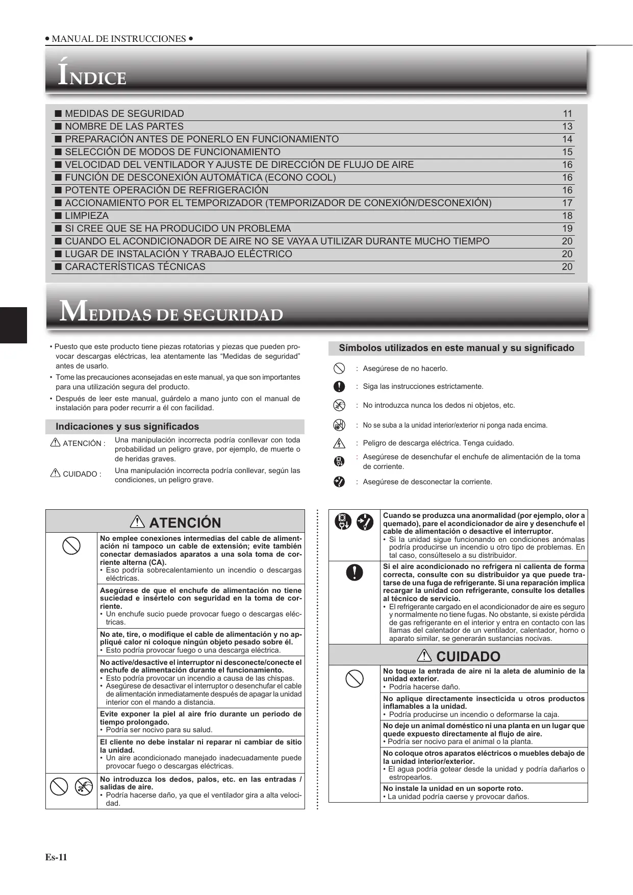 - Después de leer este manual, guárdelo a mano junto con el manual de instalación para poder recurrir a él con facilidad. Indicaciones y sus significados ATENCIÓN : CUIDADO : Una manipulación incorrecta podría conllevar con toda probabilidad un peligro grave, por ejemplo, de muerte o de heridas graves. Una manipulación incorrecta podría conllevar, según las condiciones, un peligro grave. ATENCIÓN No emplee conexiones intermedias del cable de alimentación ni tampoco un cable de extensión; evite también conectar demasiados aparatos a una sola toma de corriente alterna (CA).