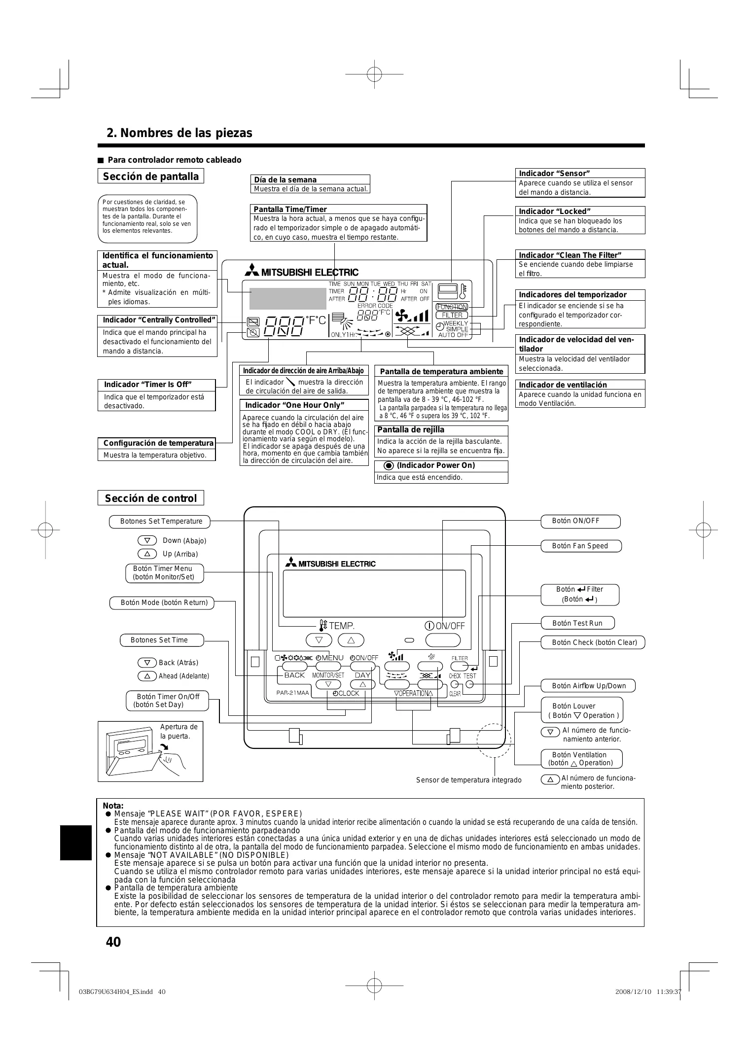 Para controlador remoto cableado Sección de pantalla Indicador “Sensor” Día de la semana Aparece cuando se utiliza el sensor del mando a distancia. Muestra el día de la semana actual. Por cuestiones de claridad, se muestran todos los componentes de la pantalla. Durante el funcionamiento real, solo se ven los elementos relevantes. Pantalla Time/Timer Muestra la hora actual, a menos que se haya configurado el temporizador simple o de apagado automático, en cuyo caso, muestra el tiempo restante. Indicador “Clean The Filter” Identifica el funcionamiento Identifies the current operation actual. Se enciende cuando debe limpiarse el filtro. Shows theeloperating mode, etc. Muestra modo de funciona* Multi-language display is supmiento, etc. ported. visualización en múlti* Admite ples idiomas. Indicadores del temporizador El indicador se enciende si se ha configurado el temporizador correspondiente. Confi guración de temperatura Temperature Setting Indicador “Locked” Indica que se han bloqueado los botones del mando a distancia. Indicador de velocidad del ventilador Indicador de dirección de aire Arriba/Abajo Pantalla de temperatura ambiente El indicador muestra la dirección de circulación del aire de salida. Muestra la temperatura ambiente. El rango de temperatura ambiente que muestra la pantalla va de 8 - 39 °C, 46-102 °F. La pantalla parpadea si la temperatura no llega a 8 °C, 46 °F o supera los 39 °C, 102 °F. Indicador “One Hour Only” Aparece cuando la circulación del aire se ha fijado en débil o hacia abajo durante el modo COOL o DRY. (El funcionamiento varía según el modelo). El indicador se apaga después de una hora, momento en que cambia también la dirección de circulación del aire. Muestra la velocidad del ventilador seleccionada. Indicador de ventilación Aparece cuando la unidad funciona en modo Ventilación. Pantalla de rejilla Indica la acción de la rejilla basculante. No aparece si la rejilla se encuentra fija. (Indicador Power On) Indica que está encendido. Sección de control Botón ON/OFF Botones Set Temperature Down (Abajo) Botón Fan Speed Up (Arriba) Botón Timer Menu (botón Monitor/Set) Botón Filter (Botón Botón Mode (botón Return) Botón Test Run Botones Set Time Botón Check (botón Clear) Back (Atrás) Ahead (Adelante) Botón Airflow Up/Down Botón Timer On/Off (botón Set Day) Botón Louver Operation ) ( Botón Apertura de la puerta. Al número de funcionamiento anterior. Botón Ventilation (botón Operation) Sensor de temperatura integrado Al número de funcionamiento posterior. Nota: Mensaje “PLEASE WAIT” (POR FAVOR, ESPERE) Este mensaje aparece durante aprox. 3 minutos cuando la unidad interior recibe alimentación o cuando la unidad se está recuperando de una caída de tensión. Pantalla del modo de funcionamiento parpadeando Cuando varias unidades interiores están conectadas a una única unidad exterior y en una de dichas unidades interiores está seleccionado un modo de funcionamiento distinto al de otra, la pantalla del modo de funcionamiento parpadea. Seleccione el mismo modo de funcionamiento en ambas unidades. Mensaje “NOT AVAILABLE” (NO DISPONIBLE) Este mensaje aparece si se pulsa un botón para activar una función que la unidad interior no presenta. Cuando se utiliza el mismo controlador remoto para varias unidades interiores, este mensaje aparece si la unidad interior principal no está equipada con la función seleccionada Pantalla de temperatura ambiente Existe la posibilidad de seleccionar los sensores de temperatura de la unidad interior o del controlador remoto para medir la temperatura ambiente. Por defecto están seleccionados los sensores de temperatura de la unidad interior. Si éstos se seleccionan para medir la temperatura ambiente, la temperatura ambiente medida en la unidad interior principal aparece en el controlador remoto que controla varias unidades interiores.