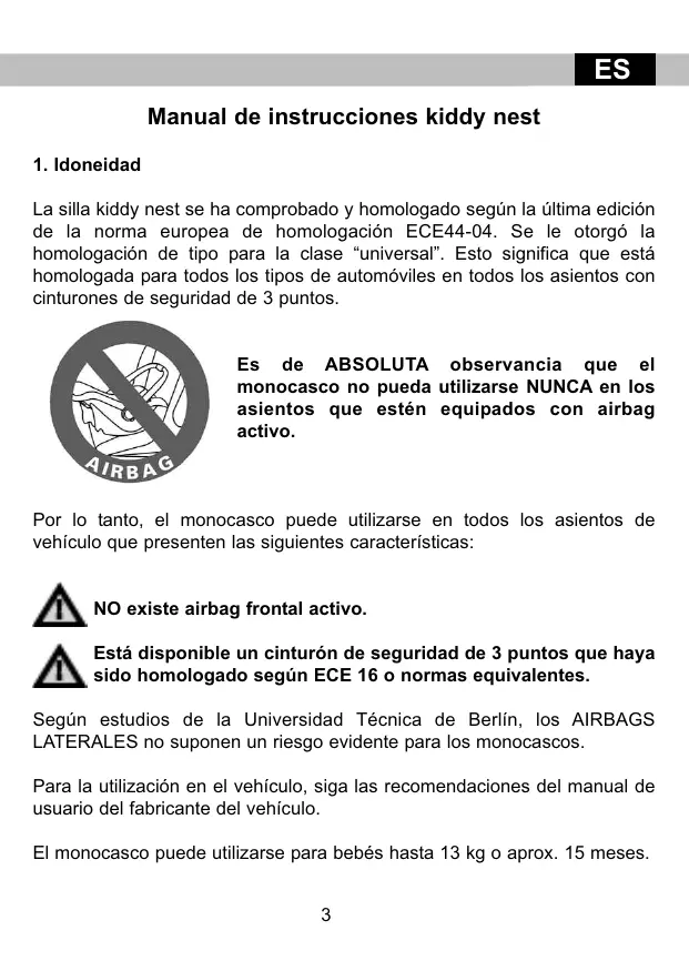 La silla kiddy nest se ha comprobado y homologado según la última edición de la norma europea de homologación ECE44-04. Se le otorgó la homologación de tipo para la clase “universal”. Esto significa que está homologada para todos los tipos de automóviles en todos los asientos con cinturones de seguridad de 3 puntos. Es de ABSOLUTA observancia que el monocasco no pueda utilizarse NUNCA en los asientos que estén equipados con airbag activo. Por lo tanto, el monocasco puede utilizarse en todos los asientos de vehículo que presenten las siguientes características: NO existe airbag frontal activo. Está disponible un cinturón de seguridad de 3 puntos que haya sido homologado según ECE 16 o normas equivalentes. Según estudios de la Universidad Técnica de Berlín, los AIRBAGS LATERALES no suponen un riesgo evidente para los monocascos. Para la utilización en el vehículo, siga las recomendaciones del manual de usuario del fabricante del vehículo. El monocasco puede utilizarse para bebés hasta 13 kg o aprox. 15 meses.