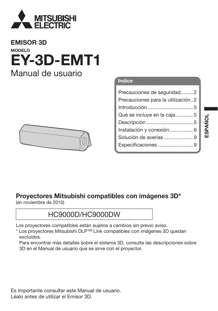 Empleando este Emisor 3D y las Gafas 3D (EY-3DGS-1U) que se venden por separado, podrá disfrutar de la visión de imágenes 3D con proyectores Mitsubishi que sean compatibles con imágenes 3D. Para la visión de imágenes 3D o para realizar los ajustes correspondientes, consulte el Manual de usuario que se sirve con el proyector.