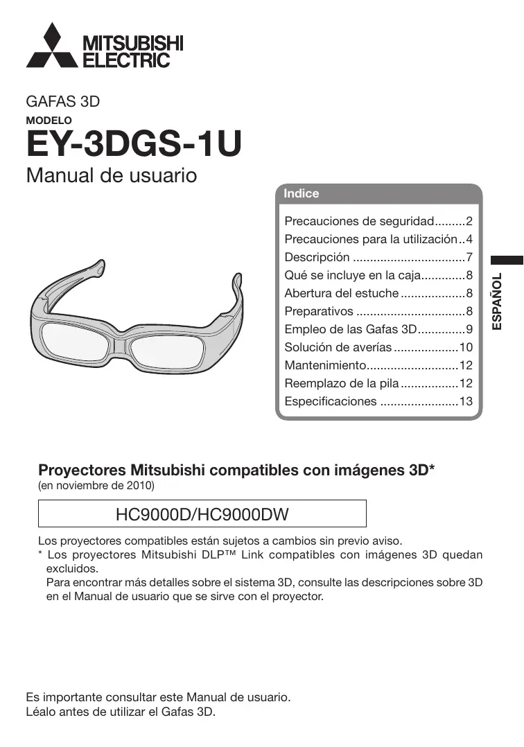 Precauciones de seguridad 2 Precauciones para la utilización ..4 Descripción 7 Qué se incluye en la caja8 Abertura del estuche 8 Preparativos 8 Empleo de las Gafas 3D 9 Solución de averías 10 Mantenimiento12 Reemplazo de la pila 12 Especificaciones 13