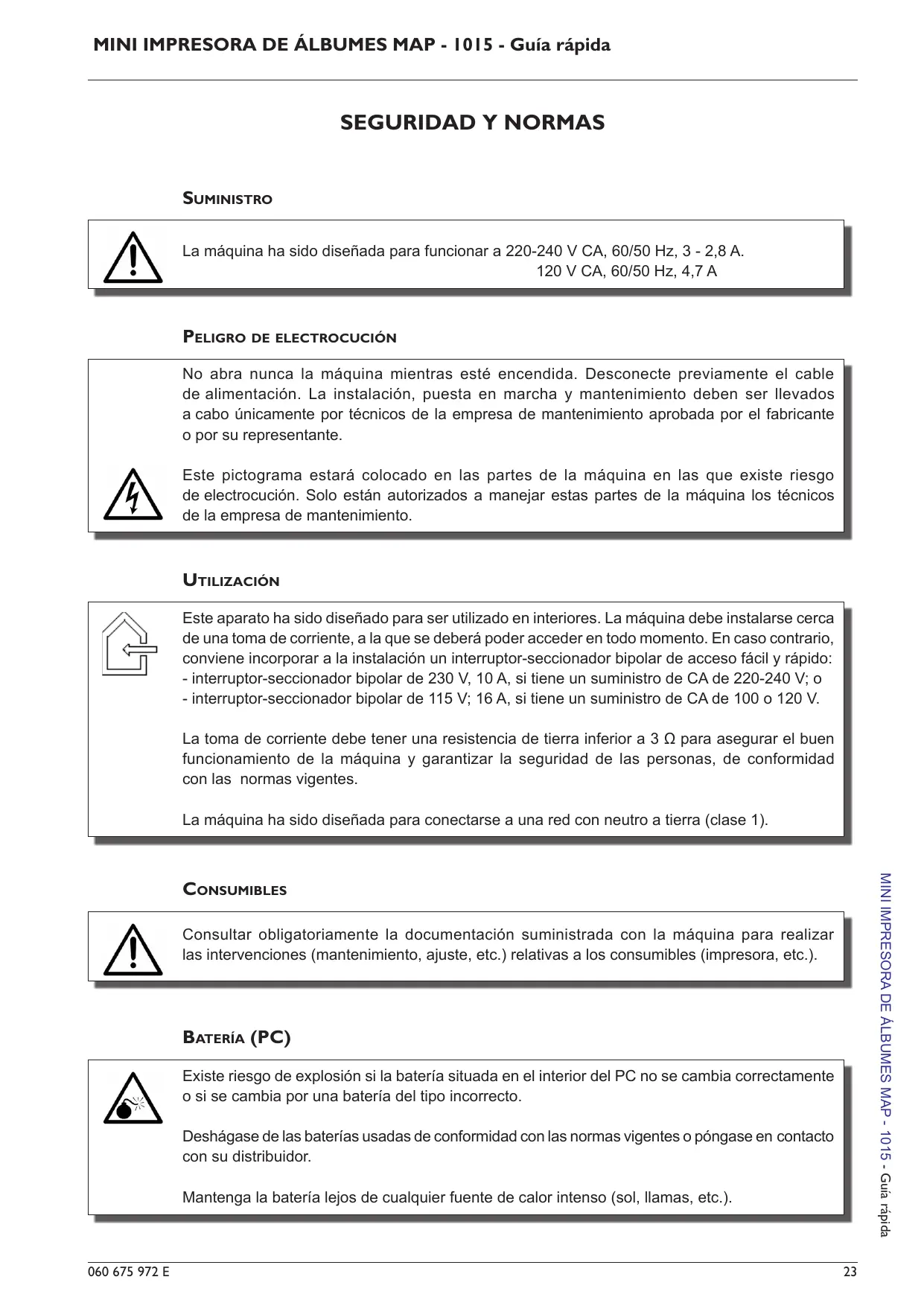 Consultar obligatoriamente la documentación suministrada con la máquina para realizar las intervenciones (mantenimiento, ajuste, etc.) relativas a los consumibles (impresora, etc.).