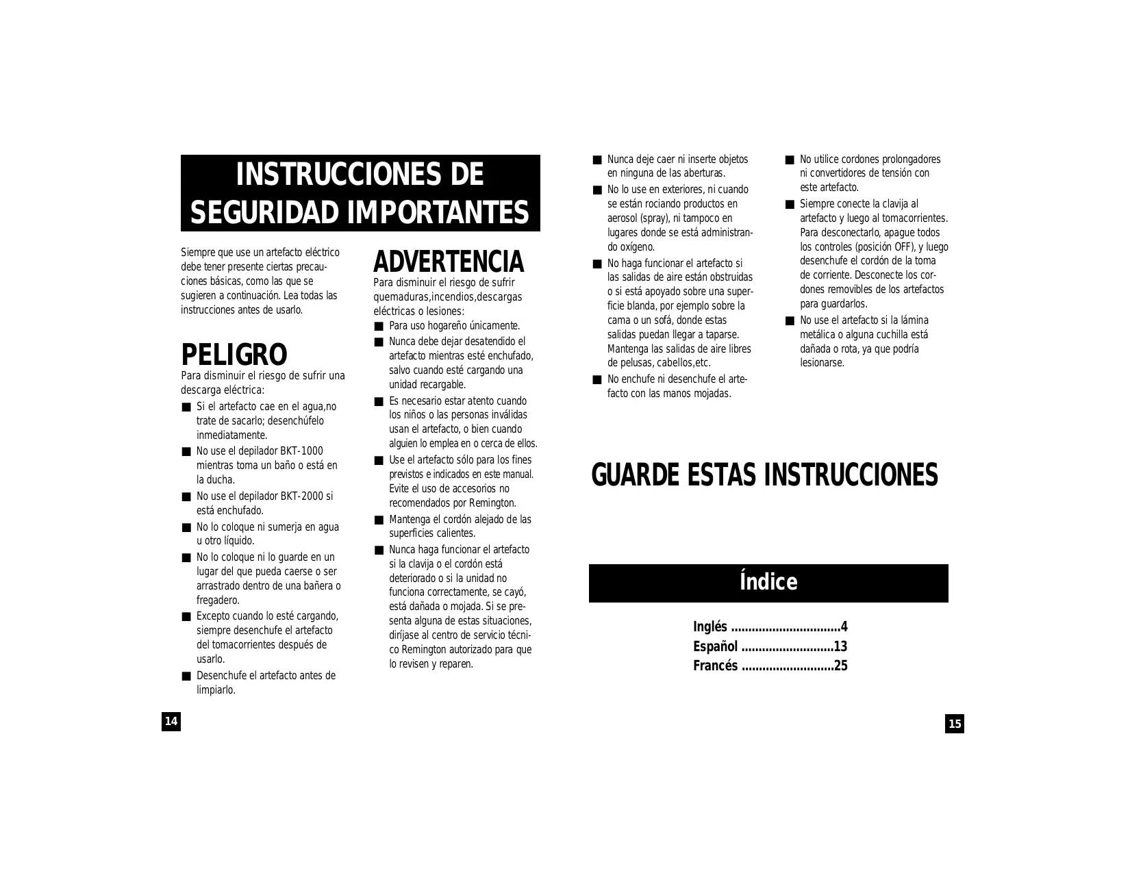 ADVERTENCIA Para disminuir el riesgo de sufrir quemaduras,incendios,descargas eléctricas o lesiones: ■ Para uso hogareño únicamente. ■ Nunca debe dejar desatendido el artefacto mientras esté enchufado, salvo cuando esté cargando una unidad recargable. ■ Es necesario estar atento cuando los niños o las personas inválidas usan el artefacto, o bien cuando alguien lo emplea en o cerca de ellos. ■ Use el artefacto sólo para los fines previstos e indicados en este manual. Evite el uso de accesorios no recomendados por Remington. ■ Mantenga el cordón alejado de las superficies calientes. ■ Nunca haga funcionar el artefacto si la clavija o el cordón está deteriorado o si la unidad no funciona correctamente, se cayó, está dañada o mojada. Si se presenta alguna de estas situaciones, diríjase al centro de servicio técnico Remington autorizado para que lo revisen y reparen. ■ Nunca deje caer ni inserte objetos en ninguna de las aberturas. ■ No lo use en exteriores, ni cuando se están rociando productos en aerosol (spray), ni tampoco en lugares donde se está administrando oxígeno. ■ No haga funcionar el artefacto si las salidas de aire están obstruidas o si está apoyado sobre una superficie blanda, por ejemplo sobre la cama o un sofá, donde estas salidas puedan llegar a taparse. Mantenga las salidas de aire libres de pelusas, cabellos,etc. ■ No enchufe ni desenchufe el artefacto con las manos mojadas. ■ No utilice cordones prolongadores ni convertidores de tensión con este artefacto. ■ Siempre conecte la clavija al artefacto y luego al tomacorrientes. Para desconectarlo, apague todos los controles (posición OFF), y luego desenchufe el cordón de la toma de corriente. Desconecte los cordones removibles de los artefactos para guardarlos. ■ No use el artefacto si la lámina metálica o alguna cuchilla está dañada o rota, ya que podría lesionarse.