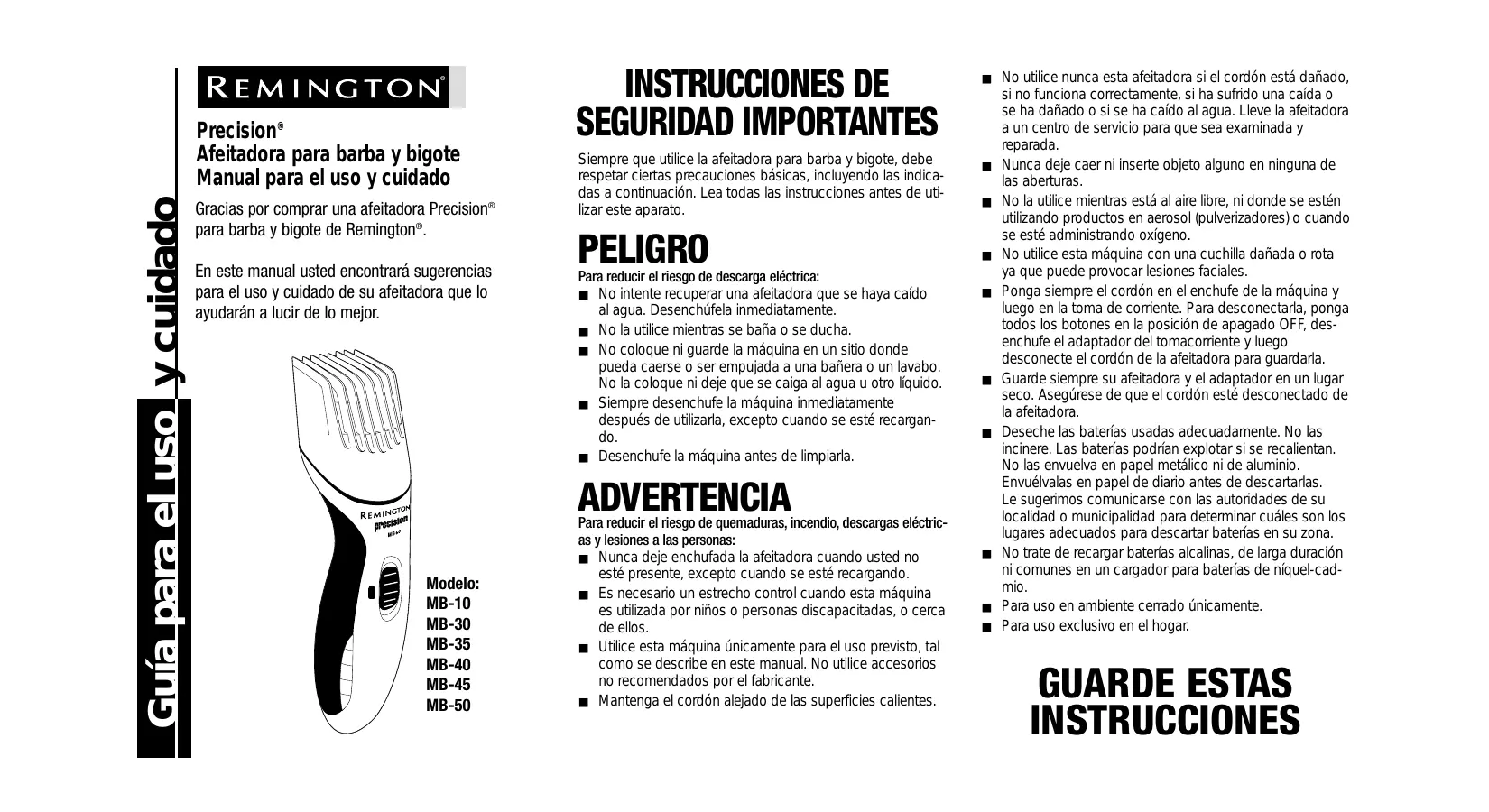 Guía para el uso y cuidado Precision® Afeitadora para barba y bigote Manual para el uso y cuidado Gracias por comprar una afeitadora Precision® para barba y bigote de Remington®. En este manual usted encontrará sugerencias para el uso y cuidado de su afeitadora que lo ayudarán a lucir de lo mejor. INSTRUCCIONES DE SEGURIDAD IMPORTANTES Siempre que utilice la afeitadora para barba y bigote, debe respetar ciertas precauciones básicas, incluyendo las indicadas a continuación. Lea todas las instrucciones antes de utilizar este aparato. PELIGRO Para reducir el riesgo de descarga eléctrica: ■ No intente recuperar una afeitadora que se haya caído al agua. Desenchúfela inmediatamente. ■ No la utilice mientras se baña o se ducha. ■ No coloque ni guarde la máquina en un sitio donde pueda caerse o ser empujada a una bañera o un lavabo. No la coloque ni deje que se caiga al agua u otro líquido. ■ Siempre desenchufe la máquina inmediatamente después de utilizarla, excepto cuando se esté recargando. ■ Desenchufe la máquina antes de limpiarla.