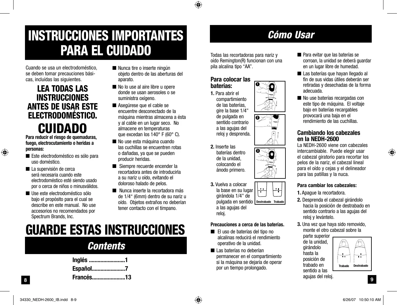 ELECTRODOMÉSTICO. CUIDADO Para reducir el riesgo de quemaduras, fuego, electrocutamiento o heridas a personas: ■ Este electrodoméstico es sólo para uso doméstico. ■ La supervisión de cerca será necesaria cuando este electrodoméstico esté siendo usado por o cerca de niños o minusválidos. ■ Use este electrodoméstico sólo bajo el propósito para el cual se describe en este manual. No use accesorios no recomendados por Spectrum Brands, Inc. ■ Nunca tire o inserte ningún objeto dentro de las aberturas del aparato. ■ No lo use al aire libre u opere donde se usan aerosoles o se suministra oxígeno. ■ Asegúrese que el cable se encuentre desconectado de la máquina mientras almacena a ésta y al cable en un lugar seco. No almacene en temperaturas que excedan los 140° F (60° C). ■ No use esta máquina cuando las cuchillas se encuentren rotas o dañadas, ya que se pueden producir heridas. ■ Siempre recuerde encender la recortadora antes de introducirla a su nariz u oído, evitando el doloroso halado de pelos. ■ Nunca inserte la recortadora más de 1/4“ (6mm) dentro de su nariz u oído. Objetos extraños no deberían tener contacto con el tímpano. Inglés .........................1 Español.......................7 Francés.......................13 34330_NEDH-2600_IB.indd 8-9 Cómo Usar Todas las recortadoras para nariz y oído Remington(R) funcionan con una pila alcalina tipo “AA”. Para colocar las baterías: