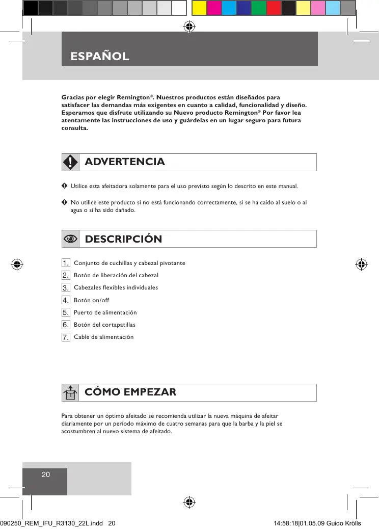+34 902 10 45 17; 08.00 - 13.00; lunes - viernes (Posventa) +34 932 070 166 (Información al consumidor final) +351 299 942 915; renase@presat.net Tel. +44 0800 212 438 (free call) Gracias por elegir Remington®. Nuestros productos están diseñados para satisfacer las demandas más exigentes en cuanto a calidad, funcionalidad y diseño. Esperamos que disfrute utilizando su Nuevo producto Remington® Por favor lea atentamente las instrucciones de uso y guárdelas en un lugar seguro para futura consulta. ADVERTENCIA Utilice esta afeitadora solamente para el uso previsto según lo descrito en este manual. o utilice este producto si no está funcionando correctamente, si se ha caído al suelo o al agua o si ha sido dañado. DESCRIPCIÓN