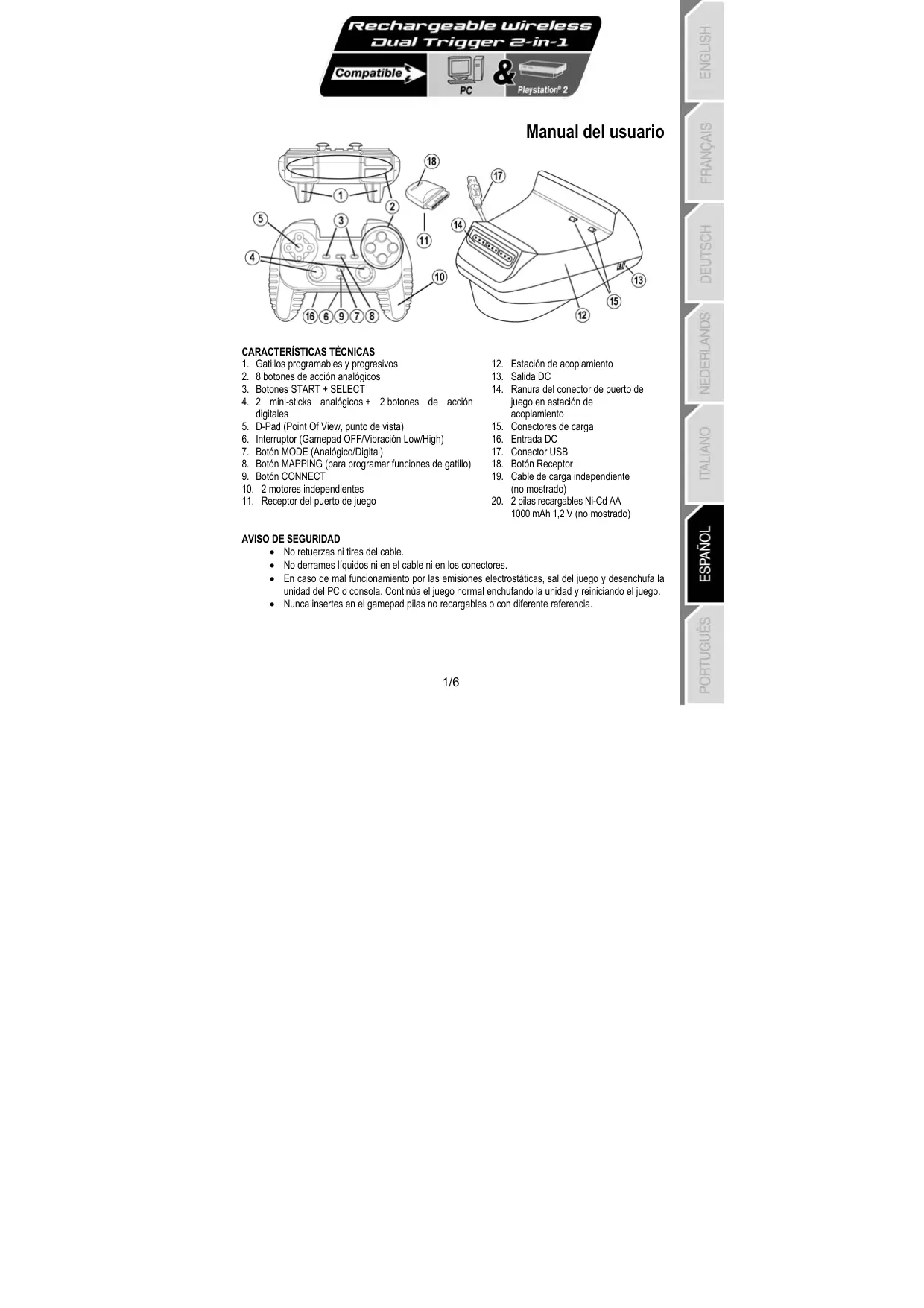 • Interruptor (6): - Posición OFF = el gamepad está apagado. - Posición VIB LOW = el gamepad está encendido, el modo de vibración está bajo (ahorra energía de las pilas). - Posición VIB HIGH = el gamepad está encendido, el modo de vibración está alto (utiliza más energía de las pilas). • Botón MODE (7): pulsa este botón para cambiar entre modos. - Modo analógico (por defecto): el botón MODE (7) se ilumina en azul. - Modo digital: el botón MODE (7) no está encendido. • Botón CONNECT (9): pulsa este botón para cambiar entre modos. - LED “Connect” está parpadeando rápidamente = no hay señal entre el gamepad y el receptor (no conectado). - LED “Connect” está iluminado = señal fuerte entre el gamepad y el receptor. - LED “Connect” está apagado = el gamepad está en modo durmiente. - LED “Connect” está parpadeando lentamente = las pilas tienen poca energía (la función de vibración se desactivará para ahorrar pilas). En este caso, enchufa el adaptador de AC del gamepad para recargar las pilas. • MODO DURMIENTE: - El gamepad se apaga automáticamente cuando no se utiliza durante 5 minutos. - Para “despertarlo”, pulsa cualquier botón. • INFORMACIÓN DE INTERCAMBIO AUTOMÁTICO DE CANALES / MULTIJUGADOR: - Puedes jugar con hasta 4 Dual Trigger Gamepad. Todos los canales se detectan automáticamente. - Cuando estés jugando en modo multijugador, si quieres intercambiar los gamepad en el transcurso de un juego, pulsa simultáneamente los botones Receptor (18) y CONNECT en el gamepad. • CARGA DE LAS PILAS RECARGABLES: - Para recargar las pilas, enchufa el conector USB (17) de la estación de acoplamiento a un puerto USB de tu PC o Playstation 2. - Coloca el gamepad en la estación de acoplamiento, con cuidado de colocar los conectores de carga del gamepad sobre los conectores de carga de la estación de acoplamiento (15) para que hagan contacto. - El LED CHARGE se volverá rojo durante la carga. - Cuando las pilas estén totalmente cargadas, el LED CHARGE se volverá verde. - Nota: puedes utilizar el gamepad mientras se está cargando. Para hacerlo, conecta el cable de carga independiente (19) a la entrada DC (16) del gamepad y a la salida DC de la estación de acoplamiento (13). MAPEADO DE LOS GATILLOS Todos los botones analógicos y direcciones del mini-stick (ejes) pueden mapearse en los gatillos Izquierdo y Derecho (excepto el D-Pad y los botones START, SELECT, L3 y R3). • Botón MAPPING (8) (utilizado para mapear los gatillos Izquierdo y Derecho): - Pulsa y suelta el botón MAPPING (el LED parpadea lentamente). - Pulsa y suelta el botón o dirección que quieras asignar al gatillo (el LED parpadea rápidamente). - Pulsa y suelta el gatillo asignado a esta función (el LED se apaga). • EEPROM: Tu gamepad incluye un chip de memoria interno, que almacena tu última configuración de mapeado incluso si apagas tu gamepad.