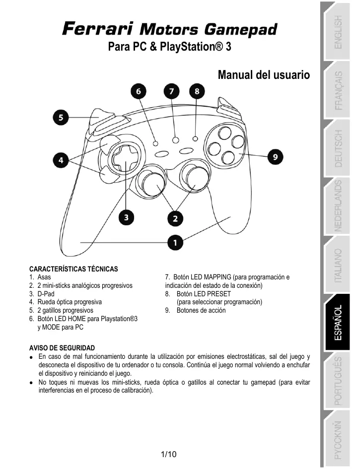 AVISO DE SEGURIDAD En caso de mal funcionamiento durante la utilización por emisiones electrostáticas, sal del juego y desconecta el dispositivo de tu ordenador o tu consola. Continúa el juego normal volviendo a enchufar el dispositivo y reiniciando el juego.