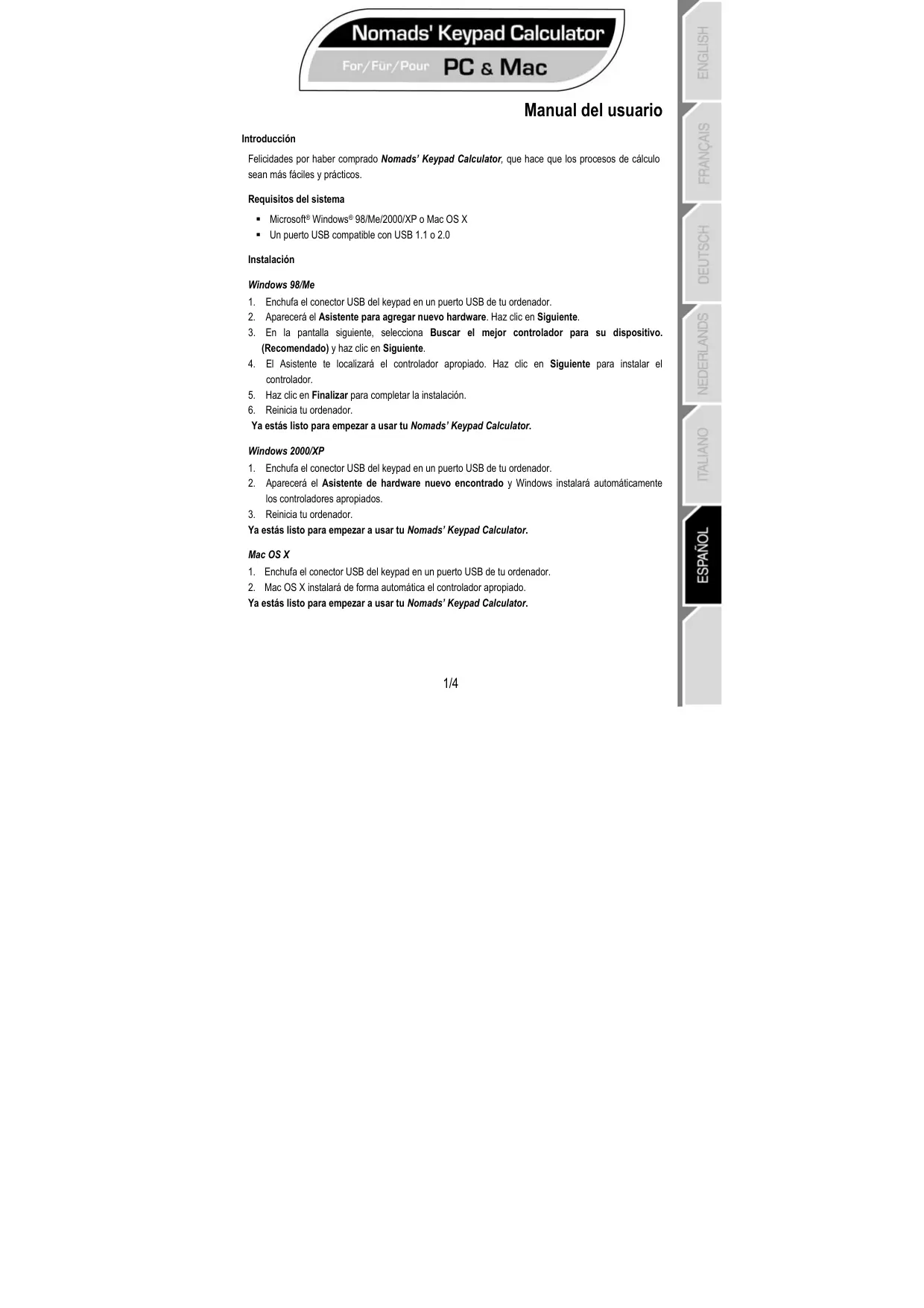 Manual del usuario Introducción Felicidades por haber comprado Nomads’ Keypad Calculator, que hace que los procesos de cálculo sean más fáciles y prácticos. Requisitos del sistema Microsoft® Windows® 98/Me/2000/XP o Mac OS X Un puerto USB compatible con USB 1.1 o 2.0 Instalación Windows 98/Me 1. Enchufa el conector USB del keypad en un puerto USB de tu ordenador. 2. Aparecerá el Asistente para agregar nuevo hardware. Haz clic en Siguiente. 3. En la pantalla siguiente, selecciona Buscar el mejor controlador para su dispositivo. (Recomendado) y haz clic en Siguiente. 4. El Asistente te localizará el controlador apropiado. Haz clic en Siguiente para instalar el controlador. 5. Haz clic en Finalizar para completar la instalación. 6. Reinicia tu ordenador. Ya estás listo para empezar a usar tu Nomads’ Keypad Calculator. Windows 2000/XP 1. Enchufa el conector USB del keypad en un puerto USB de tu ordenador. 2. Aparecerá el Asistente de hardware nuevo encontrado y Windows instalará automáticamente los controladores apropiados. 3. Reinicia tu ordenador. Ya estás listo para empezar a usar tu Nomads’ Keypad Calculator. Mac OS X 1. Enchufa el conector USB del keypad en un puerto USB de tu ordenador. 2. Mac OS X instalará de forma automática el controlador apropiado. Ya estás listo para empezar a usar tu Nomads’ Keypad Calculator.