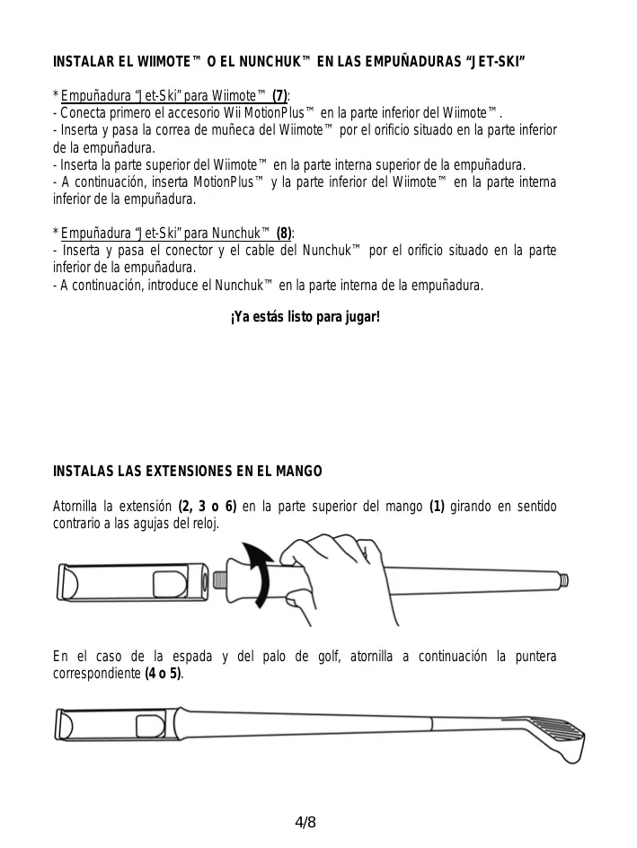 * Empuñadura “Jet-Ski” para Wiimote™ (7): - Conecta primero el accesorio Wii MotionPlus™ en la parte inferior del Wiimote™. - Inserta y pasa la correa de muñeca del Wiimote™ por el orificio situado en la parte inferior de la empuñadura. - Inserta la parte superior del Wiimote™ en la parte interna superior de la empuñadura. - A continuación, inserta MotionPlus™ y la parte inferior del Wiimote™ en la parte interna inferior de la empuñadura. * Empuñadura “Jet-Ski” para Nunchuk™ (8): - Inserta y pasa el conector y el cable del Nunchuk™ por el orificio situado en la parte inferior de la empuñadura. - A continuación, introduce el Nunchuk™ en la parte interna de la empuñadura. ¡Ya estás listo para jugar!