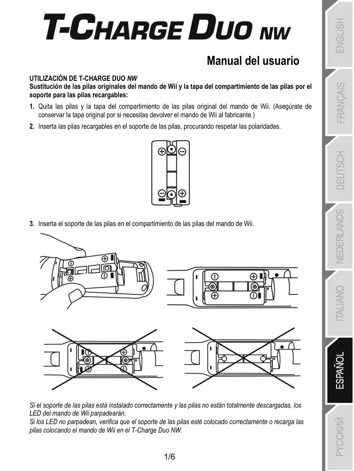Manual del usuario UTILIZACIÓN DE T-CHARGE DUO NW Sustitución de las pilas originales del mando de Wii y la tapa del compartimiento de las pilas por el soporte para las pilas recargables: 1. Quita las pilas y la tapa del compartimiento de las pilas original del mando de Wii. (Asegúrate de conservar la tapa original por si necesitas devolver el mando de Wii al fabricante.) 2. Inserta las pilas recargables en el soporte de las pilas, procurando respetar las polaridades.
