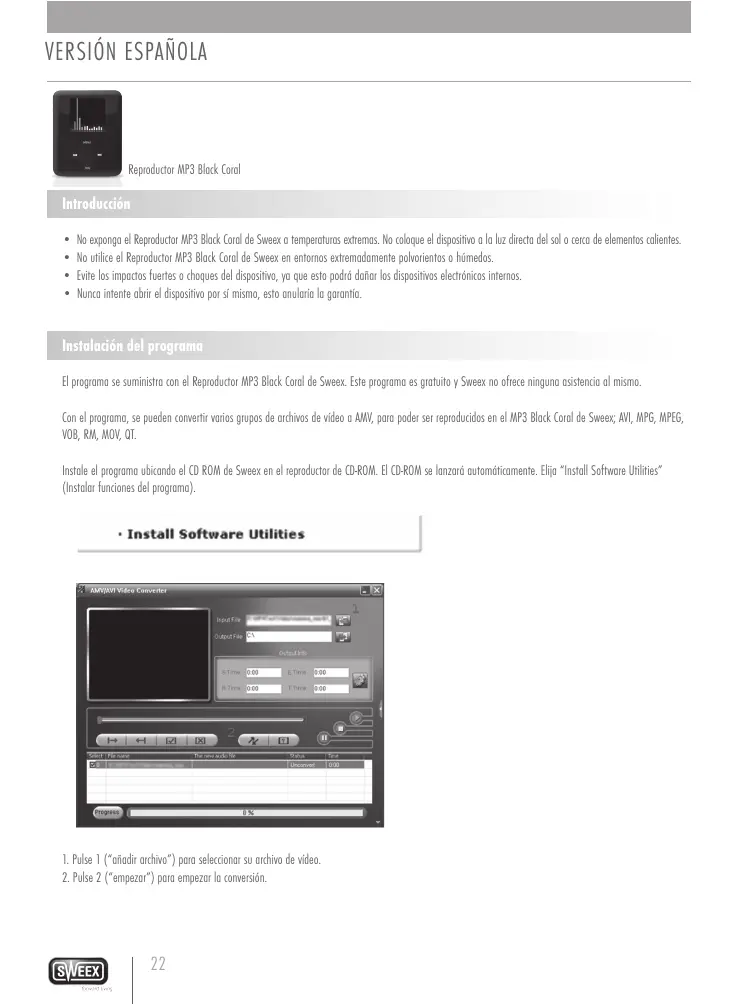 N o exponga el Reproductor MP3 Black Coral de Sweex a temperaturas extremas. No coloque el dispositivo a la luz directa del sol o cerca de elementos calientes. No utilice el Reproductor MP3 Black Coral de Sweex en entornos extremadamente polvorientos o húmedos. Evite los impactos fuertes o choques del dispositivo, ya que esto podrá dañar los dispositivos electrónicos internos. Nunca intente abrir el dispositivo por sí mismo, esto anularía la garantía. Instalación del programa El programa se suministra con el Reproductor MP3 Black Coral de Sweex. Este programa es gratuito y Sweex no ofrece ninguna asistencia al mismo. Con el programa, se pueden convertir varios grupos de archivos de vídeo a AMV, para poder ser reproducidos en el MP3 Black Coral de Sweex; AVI, MPG, MPEG, VOB, RM, MOV, QT. Instale el programa ubicando el CD ROM de Sweex en el reproductor de CD-ROM. El CD-ROM se lanzará automáticamente. Elija “Install Software Utilities” (Instalar funciones del programa).