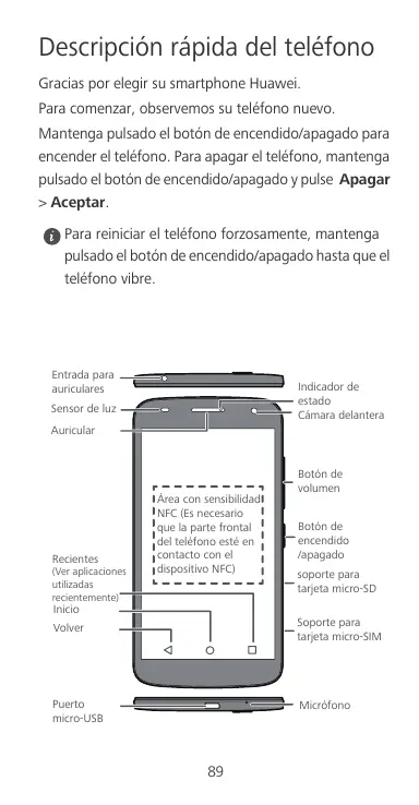 Quick Start Guide Guide de démarrage rapide Schnellstartanleitung Guida di avvio rapido Guía de inicio rápido Guia de Início Rápido Snelstartgids Descripción rápida del teléfono Gracias por elegir su smartphone Huawei. Para comenzar, observemos su teléfono nuevo. Mantenga pulsado el botón de encendido/apagado para encender el teléfono. Para apagar el teléfono, mantenga pulsado el botón de encendido/apagado y pulse Apagar > Aceptar. Para reiniciar el teléfono forzosamente, mantenga pulsado el botón de encendido/apagado hasta que el teléfono vibre. Entrada para auriculares Indicador de estado Cámara delantera Sensor de luz Auricular Recientes (Ver aplicaciones utilizadas recientemente) Área con sensibilidad NFC (Es necesario que la parte frontal del teléfono esté en contacto con el dispositivo NFC) Botón de volumen Botón de encendido /apagado soporte para tarjeta micro-SD