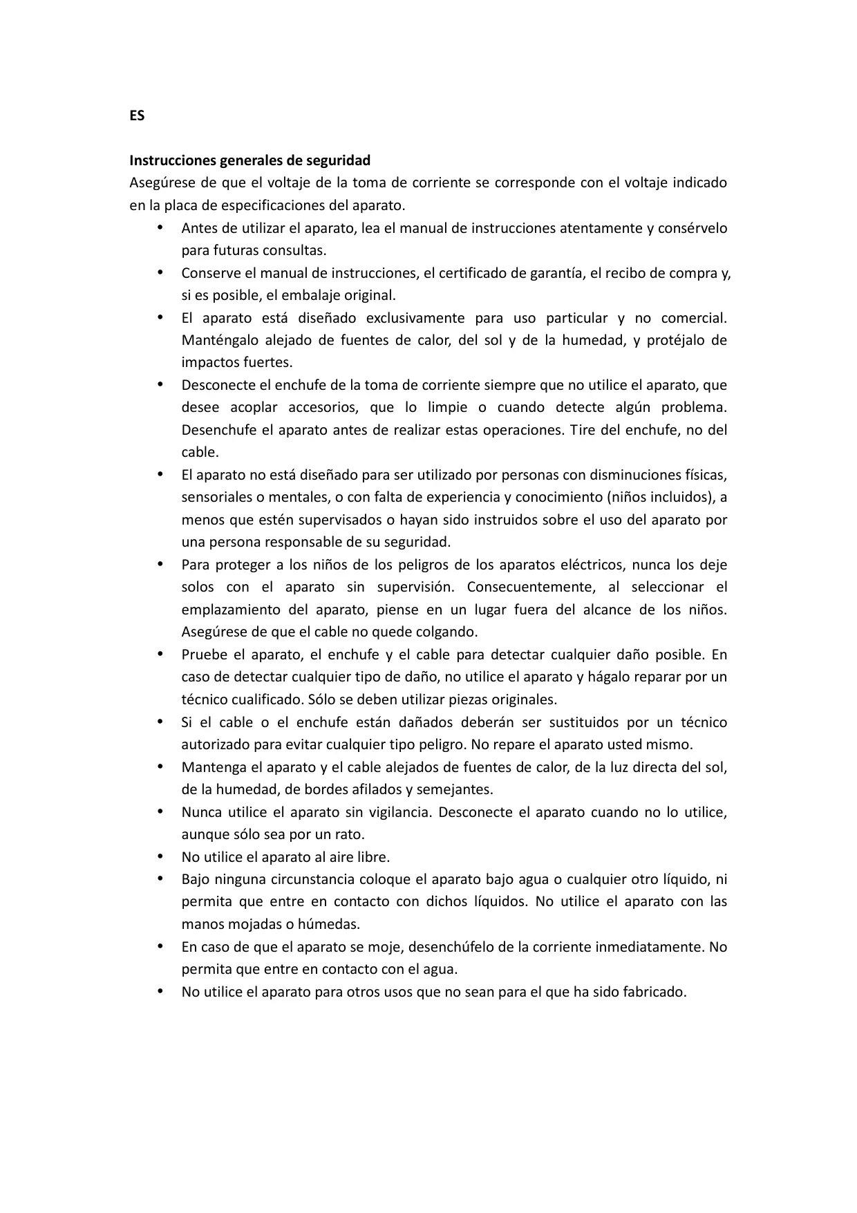 - El aparato no está Diseñado para ser utilisé por personas con disminuciones físicas, sensoriales o mentales, o con falta de experiencia y conocimiento (niños inclusos), a menos que estén supervisados o hayan sido instruidos sobre el uso del aparato por una persona responsable de su seguridad.