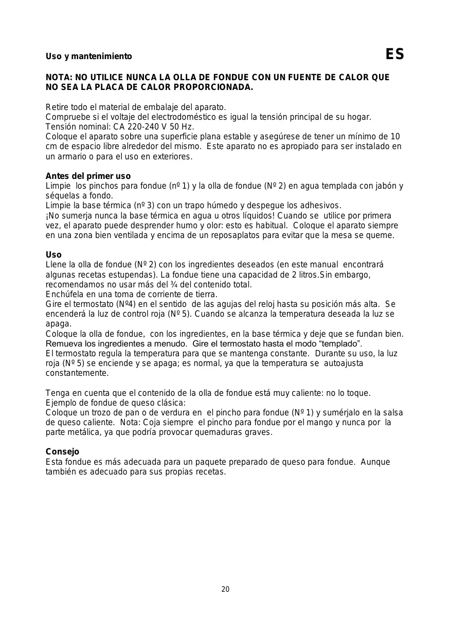 No utilise nunca limpiadores agresivos o abrasivos, estropajo de acero inoxidable o un estropajo corrente, ya que dañaría el aparato. No sumergir en agua u otherl liquido. Sumerja la olla de fondue (N° 2) en agua Templada y elimine los restos con un cepillo para lavar platos.