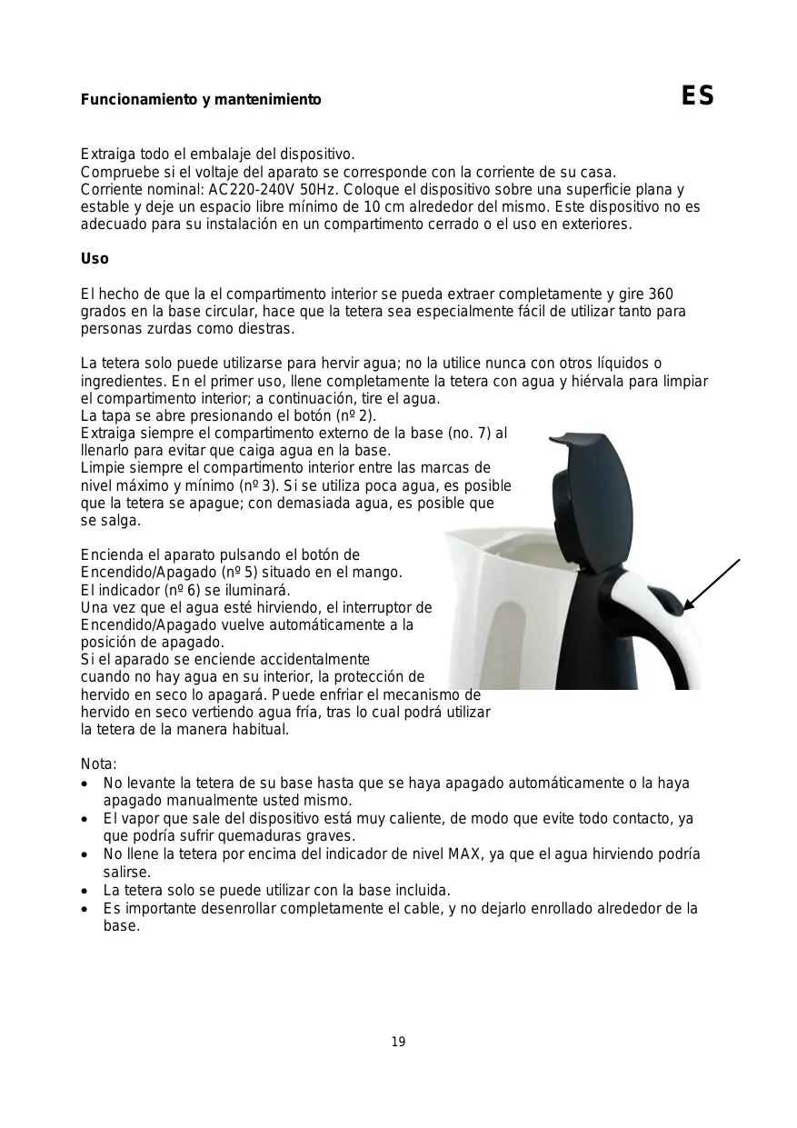 La tetera solo puede'utilarse para hervir agua; no la utilise nunca conOthers liquidos o ingredientes. En el primer uso, llene Completely la tetera con agua y hierva para limiar el compartmento interior; a continuacion, tire el agua.