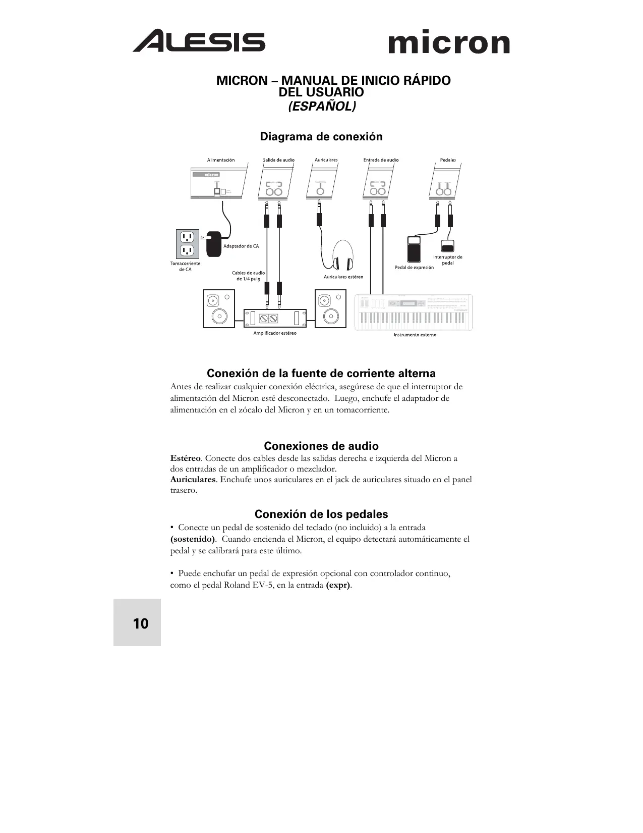 DEL USUARIO (ESPAÑOL) Diagrama de conexión Conexión de la fuente de corriente alterna Antes de realizar cualquier conexión eléctrica, asegúrese de que el interruptor de alimentación del Micron esté desconectado. Luego, enchufe el adaptador de alimentación en el zócalo del Micron y en un tomacorriente. Conexiones de audio Estéreo. Conecte dos cables desde las salidas derecha e izquierda del Micron a dos entradas de un amplificador o mezclador. Auriculares. Enchufe unos auriculares en el jack de auriculares situado en el panel trasero. Conexión de los pedales