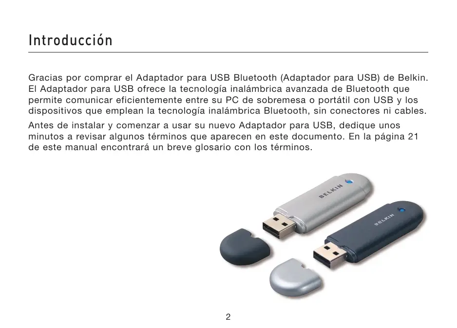 Manual del usuario F8T008 - F8T009 Introducción Gracias por comprar el Adaptador para USB Bluetooth (Adaptador para USB) de Belkin. El Adaptador para USB ofrece la tecnología inalámbrica avanzada de Bluetooth que permite comunicar eficientemente entre su PC de sobremesa o portátil con USB y los dispositivos que emplean la tecnología inalámbrica Bluetooth, sin conectores ni cables. Antes de instalar y comenzar a usar su nuevo Adaptador para USB, dedique unos minutos a revisar algunos términos que aparecen en este documento. En la página 21 de este manual encontrará un breve glosario con los términos.