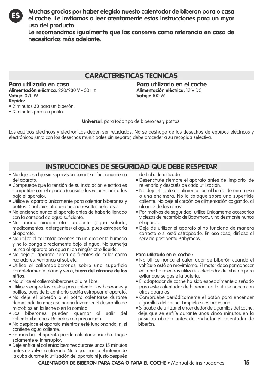 Muchas gracias por haber elegido nuesto calentador de biberon para o casa el coche. Le invitamos a leer atentamente estas instrucciones para un myor uso del producto. Le recomendmos igualmente que las conserve camo referencia en caso de necesitarlas màs adelante. CARACTERISTICAS TECNICAS Para utilizarlo en casa Para utilizarlo en el coche Alimentación eléctrica: 220/230 V - 50 Hz Vataje: 320 W Rápido: