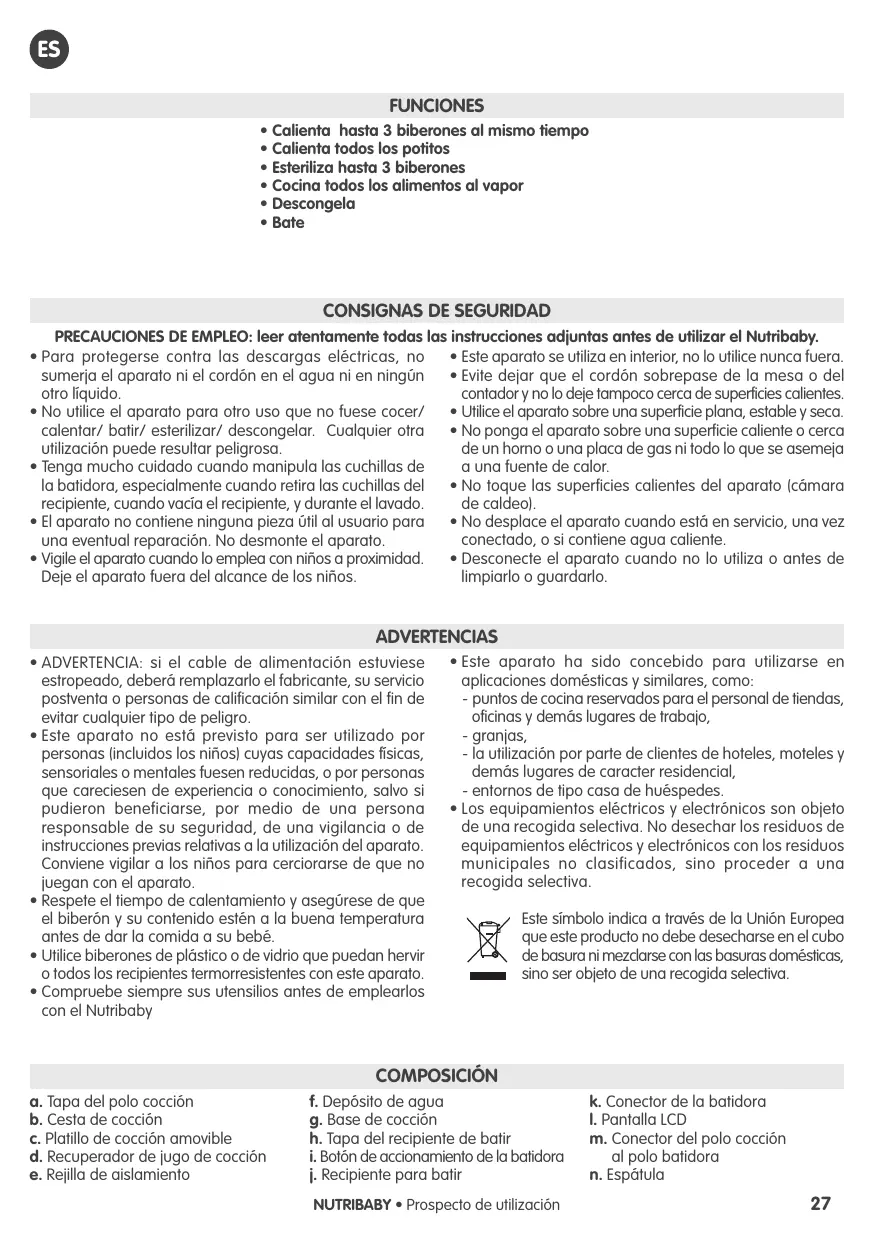 CONSIGNAS DE SEGURIDAD PRECAUCIONES DE EMPLEO: leer atentamente todas las instrucciones adjuntas antes de utilizar el Nutribaby.