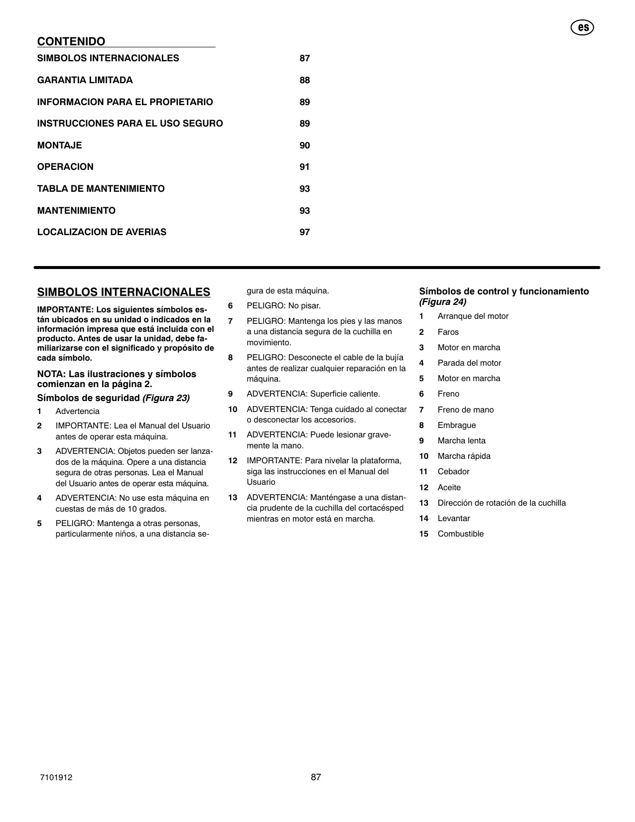 Autorizado puede hacer reparaciones bajo garantía. La mayor parte de las reparaciones bajo garantía son de rutina, pero es posible que algunas no sean apropiadas. Por ejemplo, el servicio de garantía podría no aplicarse si el daño al producto ocurrió debido a uso inadecuado, falta del mantenimiento habitual, transporte, manejo, bodegaje o instalación inapropiados. De igual manera se invalidará la garantía si el número de serie del producto ha sido borrado o si el producto ha sido alterado o modificado. Esta garantía cubre únicamente los defectos en materiales o mano de obra. Con el fin de evitar que surjan malentendidos entre el cliente y el Distribuidor, se enumeran a continuación algunas de las causas de fallas en el producto que la garantía no cubre. x Desgaste Normal: El equipo de motor pequeño, como todos los aparatos mecánicos, necesita partes y servicio periódico para funcionar bien. La garantía no cubre la reparación cuando el uso normal haya agotado la vida útil de una parte o del producto. x Instalación: Esta garantía no será válida para productos que hayan sido alterados, modificados o instalados de forma incorrecta o sin autorización. Las instalaciones que impiden el arranque provocan un rendimiento insatisfactorio del motor. x Mantenimiento inadecuado: La vida útil de este producto depende de las condiciones en las que funciona y del cuidado con que se lo trata. Los intervalos de mantenimiento y ajuste recomendados figuran en el Manual del Operador. A menudo se utilizan los productos como las cultivadoras, las bordeadoras y las máquinas cortacésped rotantes en condiciones de gran exposición al polvo o la suciedad, que pueden provocar un aparente desgaste prematuro. Dicho desgaste, cuando haya sido causado por el ingreso de suciedad, polvo u otros materiales abrasivos al producto debido a un mantenimiento inadecuado, no será cubierto por la garantía. La garantía no cubre reparaciones de problemas causados por el uso de piezas de repuesto que no sean las originales. x Uso de combustible o lubricación incorrecto o insuficiente: Esta garantía no cubre el daño causado por el uso de combustible viejo o de gasolinas alteradas. El daño al motor o a sus componentes como la cámara de combustión, las válvulas, los asientos de las válvulas, las guías de las válvulas o los bobinados del motor de arranque quemados, causado por el uso de combustibles alternos tales como gas propano o gas natural tampoco está cubierto por la garantía a menos que el motor esté certificado para su uso con estos combustibles. Tampoco se cubren las piezas que estén rayadas o rotas porque el producto fue utilizado con aceite lubricante insuficiente, contaminado o de grado incorrecto de viscosidad, ni los componentes dañados por falta de lubricación. x Uso inadecuado: El uso correcto del producto está descrito en el Manual del Operador. La garantía no cubre los productos dañados por exceso de velocidad, sobrecalentamiento o funcionamiento en un espacio cerrado sin ventilación suficiente. Tampoco cubre productos rotos por exceso de vibración causado por un montaje flojo del motor, cuchillas de corte flojas o impulsores flojos o no balanceados, exceso de velocidad, o cigüeñal doblado por golpear un objeto sólido. Tampoco cubre daños o mal funcionamiento debido a accidentes, uso indebido o servicio inadecuado, congelamiento o deterioro por agentes químicos, ni a la operación por encima de las capacidades recomendadas tal como se describen en el Manual del Operador. x Afinación, ajustes o desgastes de rutina: Esta garantía excluye los artículos que se consumen o desgastan como el aceite, las correas, las cuchillas, los o-rings, los filtros, etc. x Otras exclusiones: La reparación o los ajustes a las piezas no fabricadas por Briggs & Stratton Corporation no están incluidas. Consulte la garantía de los fabricantes correspondientes. Esta garantía excluye las fallas debidas a casos fortuitos y otros casos de fuerza mayor que el fabricante no puede controlar. También excluye los equipos usados o reacondicionados y los destinados a demostraciones.