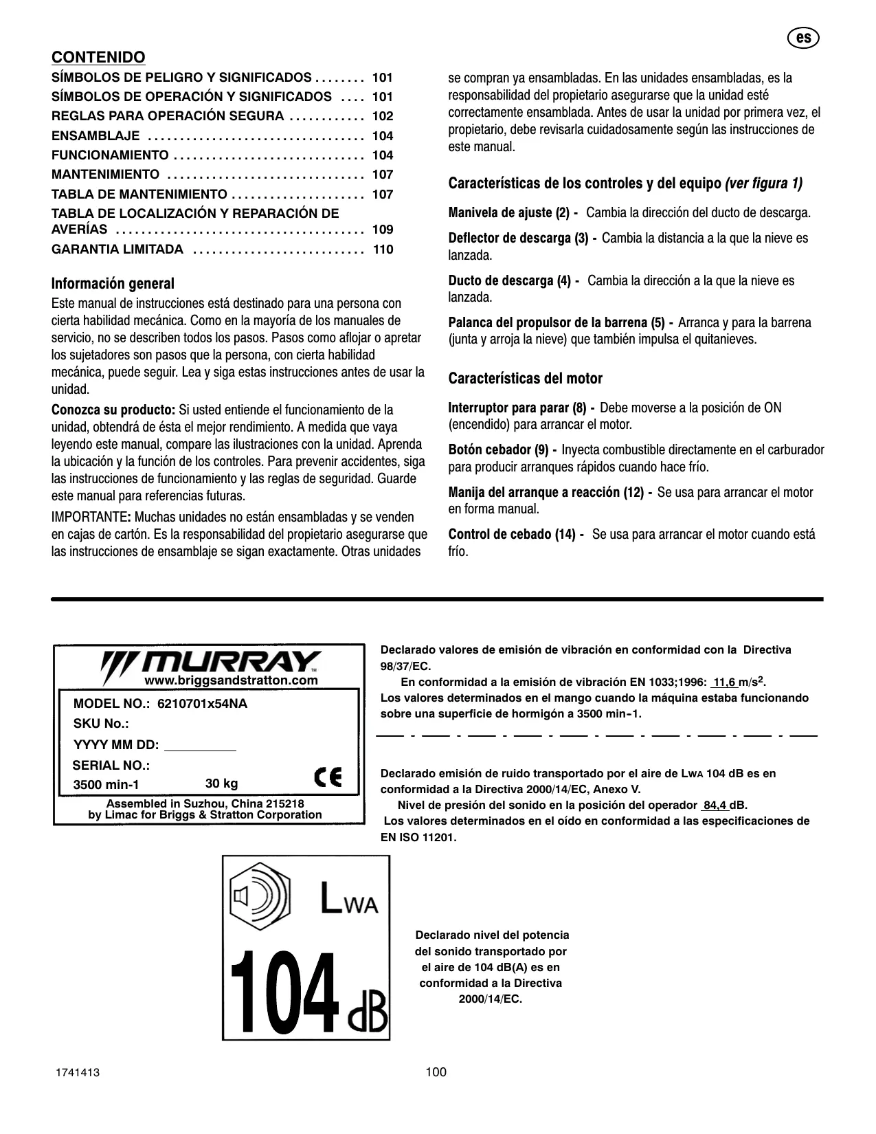 GARANTIA LIMITADA Briggs & Stratton Corporation reparará o reemplazará, sin costo alguno, cualquier parte del producto considerada como defectuosa en material, mano de obra o ambos. Los gastos de transporte de los productos sometidos a reparación o cambio según esta Garantía deben ser abonados por el comprador. Esta garantía tiene vigencia durante el período señalado en la misma, quedando sujeta a las condiciones establecidas en esta póliza. Para recibir servicio de garantía, comuníquese con el Distribuidor de Servicio Autorizado más cercano. Podrá encontrarlo en nuestro mapa de localización de distribuidores en www.murray.com.