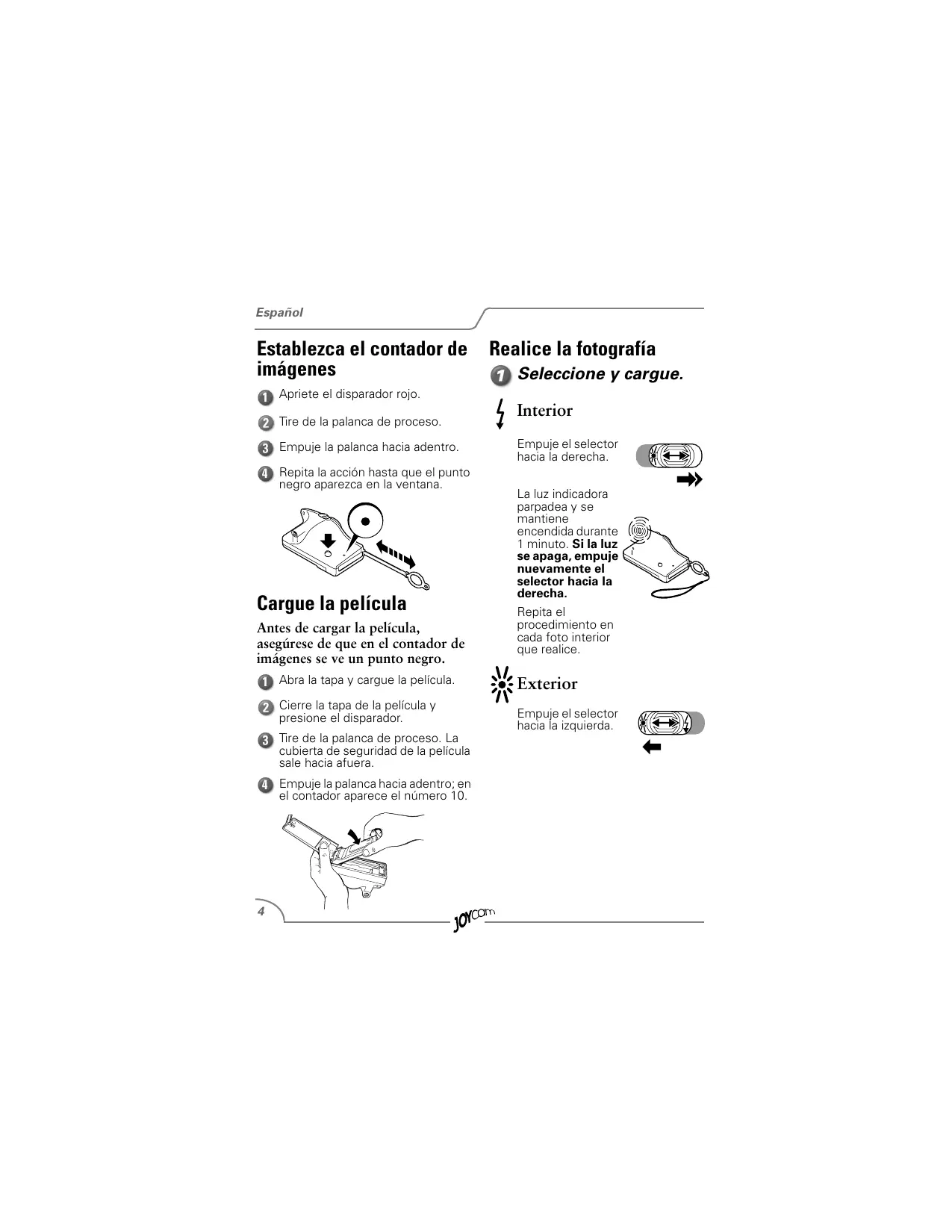 Antes de cargar la película, asegúrese de que en el contador de imágenes se ve un punto negro. Abra la tapa y cargue la película. Cierre la tapa de la película y presione el disparador. Tire de la palanca de proceso. La cubierta de seguridad de la película sale hacia afuera. Empuje la palanca hacia adentro; en el contador aparece el número 10.