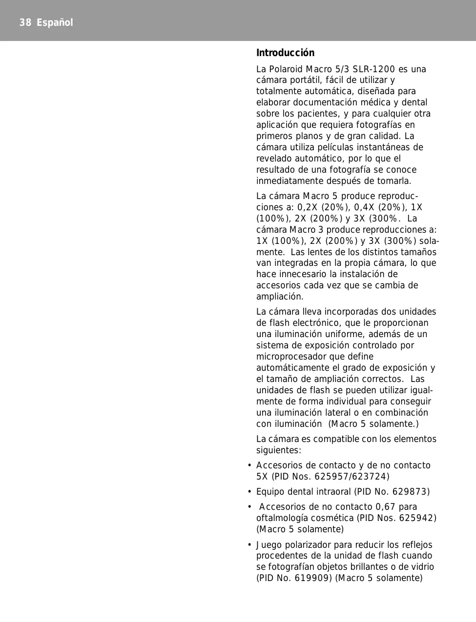 38 Español Introducción La Polaroid Macro 5/3 SLR-1200 es una cámara portátil, fácil de utilizar y totalmente automática, diseñada para elaborar documentación médica y dental sobre los pacientes, y para cualquier otra aplicación que requiera fotografías en primeros planos y de gran calidad. La cámara utiliza películas instantáneas de revelado automático, por lo que el resultado de una fotografía se conoce inmediatamente después de tomarla. La cámara Macro 5 produce reproducciones a: 0,2X (20%), 0,4X (20%), 1X (100%), 2X (200%) y 3X (300%. La cámara Macro 3 produce reproducciones a: 1X (100%), 2X (200%) y 3X (300%) solamente. Las lentes de los distintos tamaños van integradas en la propia cámara, lo que hace innecesario la instalación de accesorios cada vez que se cambia de ampliación. La cámara lleva incorporadas dos unidades de flash electrónico, que le proporcionan una iluminación uniforme, además de un sistema de exposición controlado por microprocesador que define automáticamente el grado de exposición y el tamaño de ampliación correctos. Las unidades de flash se pueden utilizar igualmente de forma individual para conseguir una iluminación lateral o en combinación con iluminación (Macro 5 solamente.) La cámara es compatible con los elementos siguientes: