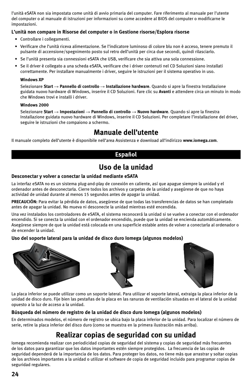 - Si la unidad está conectada a la tarjeta eSATA, asegúrese de que los controladores incluidos en el CD de soluciones estén correctamente instalados. Para instalar los controladores manualmente, siga las instrucciones para su sistema operativo. Windows XP Seleccione Inicio Panel de control Agregar hardware. Cuando aparezca el Asistente para agregar hardware de Windows, introduzca el CD de soluciones. Haga clic en Siguiente y espere un minuto para que Windows busque e instale los controladores. Windows 2000 Seleccione Inicio Configuración Panel de Control Agregar hardware. Cuando aparezca el Asistente para agregar hardware de Windows, introduzca el CD de soluciones. Siga las instrucciones que aparecen en la pantalla para completar la instalación del controlador. Manual del usuario El manual de usuario completo en formato HTML está disponible en el área de asistencia y descargas del sitio www.iomega.com. Para obtener información sobre servicio y asistencia técnica para su producto Iomega, visítenos en www.iomega.com.