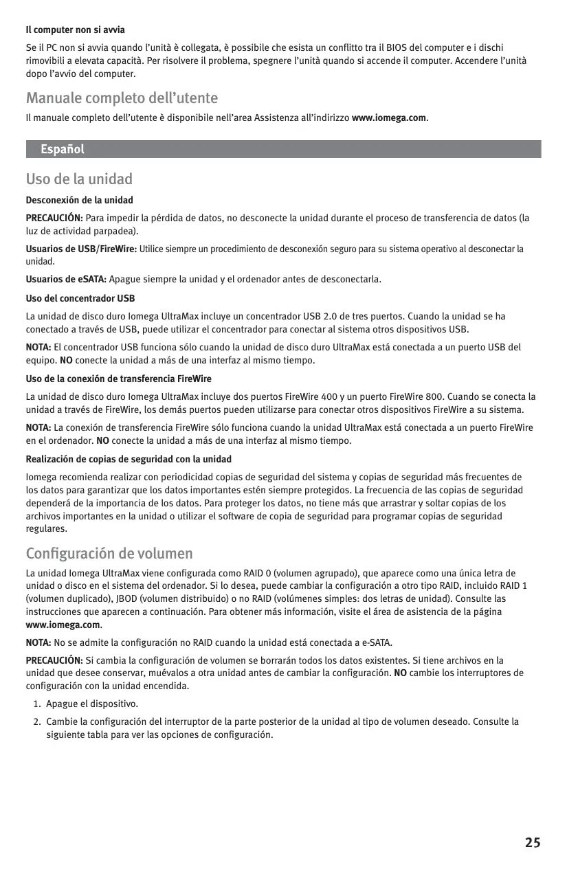 de la unidad y reinicie el equipo. Usuarios de Mac: La unidad debe estar montada y aparecer en el Escritorio de Mac. Usuarios de PC: El ordenador no reconocerá la unidad hasta que la vuelva a formatear. Consulte las instrucciones que aparecen a la izquierda sobre Formateo de la unidad para Windows. USB FireWire/1394/i.Link eSATA SATA Uso de la unidad Desconexión de la unidad PRECAUCIÓN: Para impedir la pérdida de datos, no desconecte la unidad durante el proceso de transferencia de datos (la luz de actividad parpadea). Usuarios de USB/FireWire: Utilice siempre un procedimiento de desconexión seguro para su sistema operativo al desconectar la unidad. Usuarios de eSATA: Apague siempre la unidad y el ordenador antes de desconectarla. Uso del concentrador USB La unidad de disco duro Iomega UltraMax incluye un concentrador USB 2.0 de tres puertos. Cuando la unidad se ha conectado a través de USB, puede utilizar el concentrador para conectar al sistema otros dispositivos USB. NOTA: El concentrador USB funciona sólo cuando la unidad de disco duro UltraMax está conectada a un puerto USB del equipo. NO conecte la unidad a más de una interfaz al mismo tiempo. Uso de la conexión de transferencia FireWire La unidad de disco duro Iomega UltraMax incluye dos puertos FireWire 400 y un puerto FireWire 800. Cuando se conecta la unidad a través de FireWire, los demás puertos pueden utilizarse para conectar otros dispositivos FireWire a su sistema. NOTA: La conexión de transferencia FireWire sólo funciona cuando la unidad UltraMax está conectada a un puerto FireWire en el ordenador. NO conecte la unidad a más de una interfaz al mismo tiempo. Realización de copias de seguridad con la unidad Iomega recomienda realizar con periodicidad copias de seguridad del sistema y copias de seguridad más frecuentes de los datos para garantizar que los datos importantes estén siempre protegidos. La frecuencia de las copias de seguridad dependerá de la importancia de los datos. Para proteger los datos, no tiene más que arrastrar y soltar copias de los archivos importantes en la unidad o utilizar el software de copia de seguridad para programar copias de seguridad regulares. Configuración de volumen La unidad Iomega UltraMax viene configurada como RAID 0 (volumen agrupado), que aparece como una única letra de unidad o disco en el sistema del ordenador. Si lo desea, puede cambiar la configuración a otro tipo RAID, incluido RAID 1 (volumen duplicado), JBOD (volumen distribuido) o no RAID (volúmenes simples: dos letras de unidad). Consulte las instrucciones que aparecen a continuación. Para obtener más información, visite el área de asistencia de la página www.iomega.com. NOTA: No se admite la configuración no RAID cuando la unidad está conectada a e-SATA. PRECAUCIÓN: Si cambia la configuración de volumen se borrarán todos los datos existentes. Si tiene archivos en la unidad que desee conservar, muévalos a otra unidad antes de cambiar la configuración. NO cambie los interruptores de configuración con la unidad encendida.
