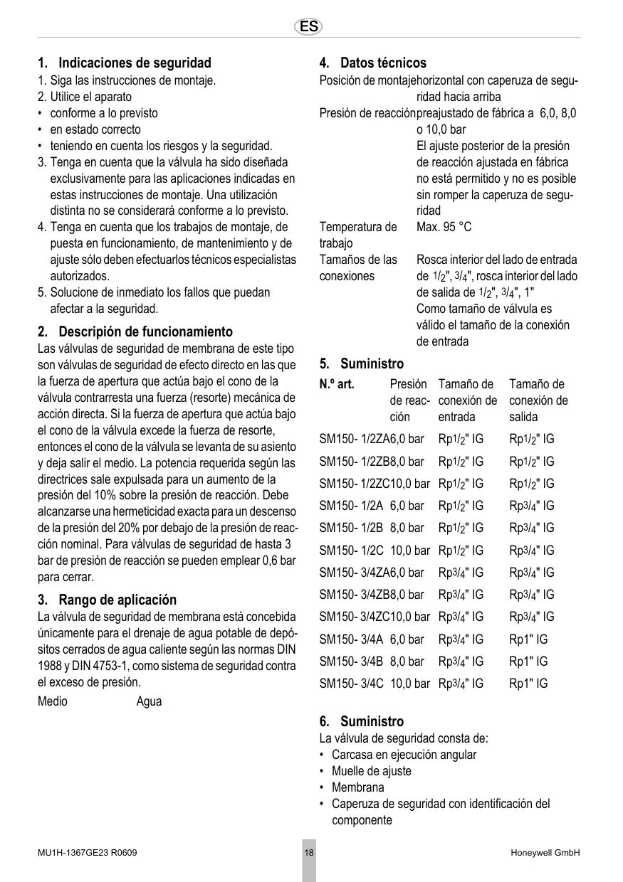 La válvula de seguridad consta de: • Carcasa en ejecución angular • Muelle de ajuste • Membrana • Caperuza de seguridad con identificación del componente MU1H-1367GE23 R0609