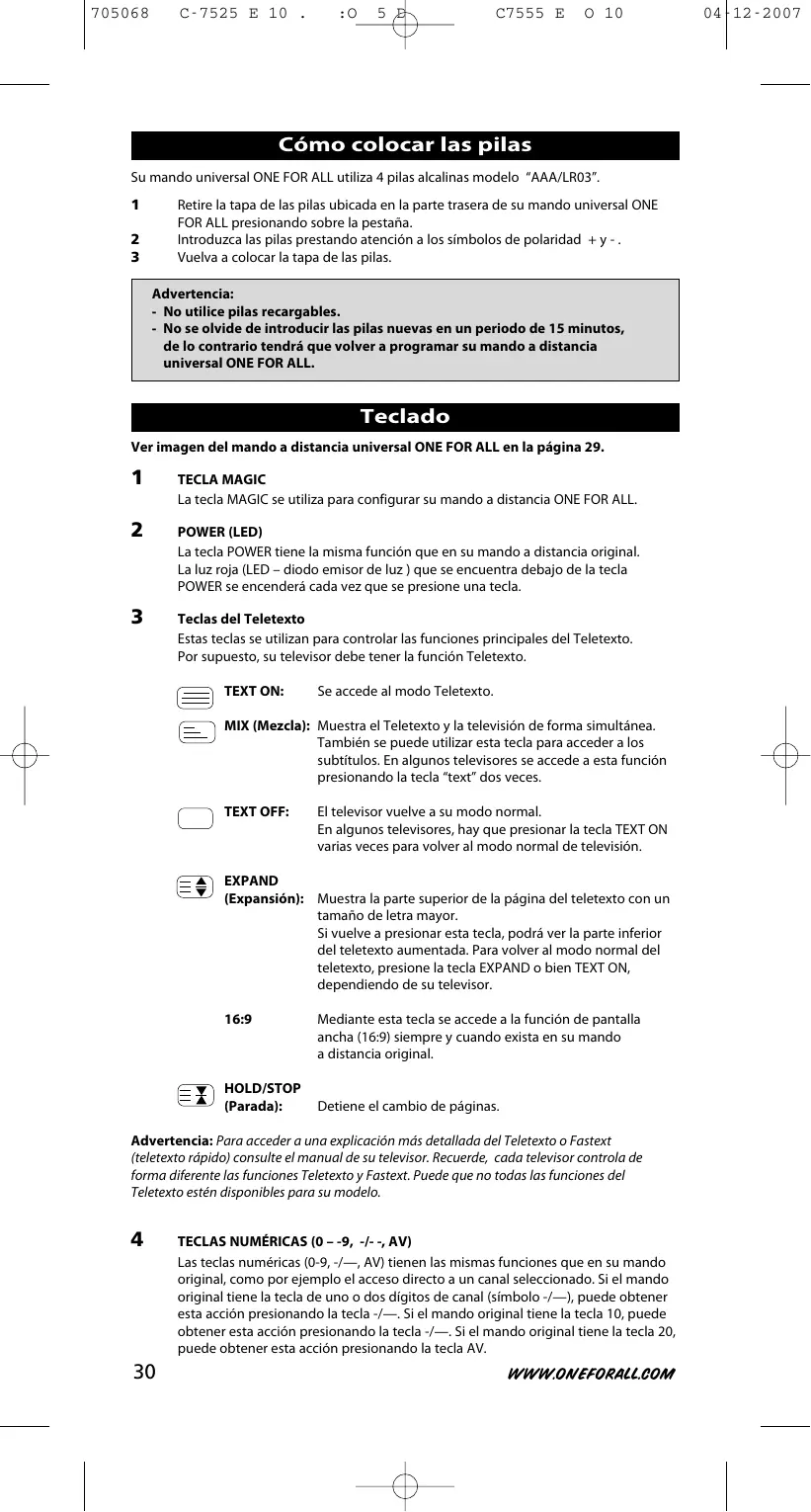 Las teclas de colores (roja, verde, amarilla y azul) le permiten operar dentro del modo de teletexto, siempre y cuando tenga estas funciones disponibles en el mando original de su televisor. Si su mando original utiliza estas teclas para el Menú, el mando universal ONE FOR ALL hará lo mismo.