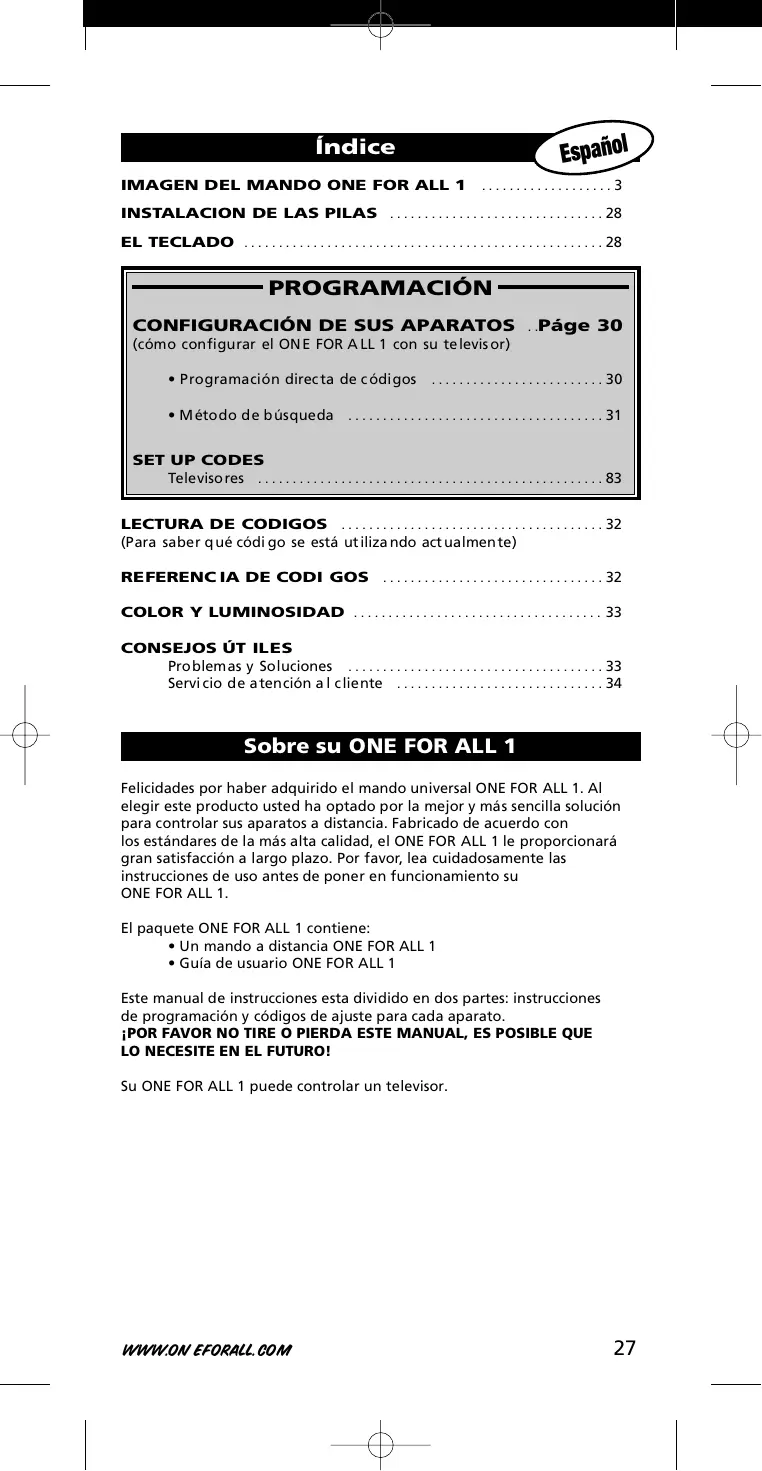 Felicidades por haber adquirido el mando universal ONE FOR ALL 1. Al elegir este producto usted ha optado por la mejor y más sencilla solución para controlar sus aparatos a distancia. Fabricado de acuerdo con los estándares de la más alta calidad, el ONE FOR ALL 1 le proporcionará gran satisfacción a largo plazo. Por favor, lea cuidadosamente las instrucciones de uso antes de poner en funcionamiento su ONE FOR ALL 1. El paquete ONE FOR ALL 1 contiene: • Un mando a distancia ONE FOR ALL 1 • Guía de usuario ONE FOR ALL 1 Este manual de instrucciones esta dividido en dos partes: instrucciones de programación y códigos de ajuste para cada aparato. ¡POR FAVOR NO TIRE O PIERDA ESTE MANUAL, ES POSIBLE QUE LO NECESITE EN EL FUTURO! Su ONE FOR ALL 1 puede controlar un televisor.