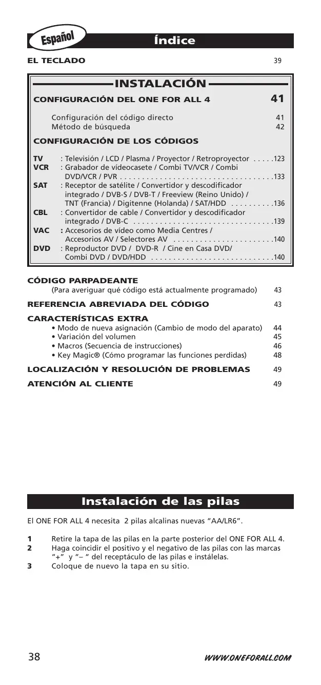 Key Magic® Cómo programar las funciones perdidas Key Magic es una característica exclusiva del ONE FOR ALL. El diseño del ONE FOR ALL garantiza que podrán utilizarse muchas de las funciones del mando a distancia original —incluso aquellas que no tengan su propia tecla en el teclado numérico del ONE FOR ALL. Las funciones que se utilizan con frecuencia se pueden asignar a una tecla de su elección usando la característica Key Magic del ONE FOR ALL. Para programar una determinada función con Key Magic es necesario que sepa el correspondiente código de esa función. Puesto que estos códigos de función varían con los distintos tipos de aparatos, no podrán encontrarse en el manual. Podrá solicitar los códigos de las funciones llamando a nuestro servicio de atención al cliente o enviándonos un fax o un correo electrónico. Indíquenos: • El código de configuración de 4 dígitos con el que funciona su aparato. • Cómo se señaló la función en el mando a distancia original. Cuando haya obtenido el código o los códigos de la función o funciones de nuestro servicio de atención al cliente, la programación del código es sencilla: 1