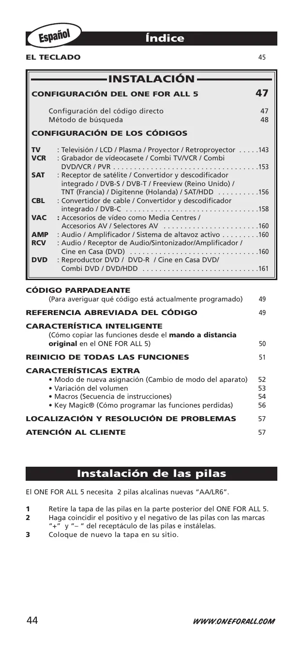 Key Magic® Cómo programar las funciones perdidas Key Magic es una característica exclusiva del ONE FOR ALL. El diseño del ONE FOR ALL garantiza que podrán utilizarse muchas de las funciones del mando a distancia original —incluso aquellas que no tengan su propia tecla en el teclado numérico del ONE FOR ALL. Las funciones que se utilizan con frecuencia se pueden asignar a una tecla de su elección usando la característica Key Magic del ONE FOR ALL. Para programar una determinada función con Key Magic es necesario que sepa el correspondiente código de esa función. Puesto que estos códigos de función varían con los distintos tipos de aparatos, no podrán encontrarse en el manual. Podrá solicitar los códigos de las funciones llamando a nuestro servicio de atención al cliente o enviándonos un fax o un correo electrónico. Indíquenos: • El código de configuración de 4 dígitos con el que funciona su aparato. • Cómo se señaló la función en el mando a distancia original. Cuando haya obtenido el código o los códigos de la función o funciones de nuestro servicio de atención al cliente, la programación del código es sencilla: 1