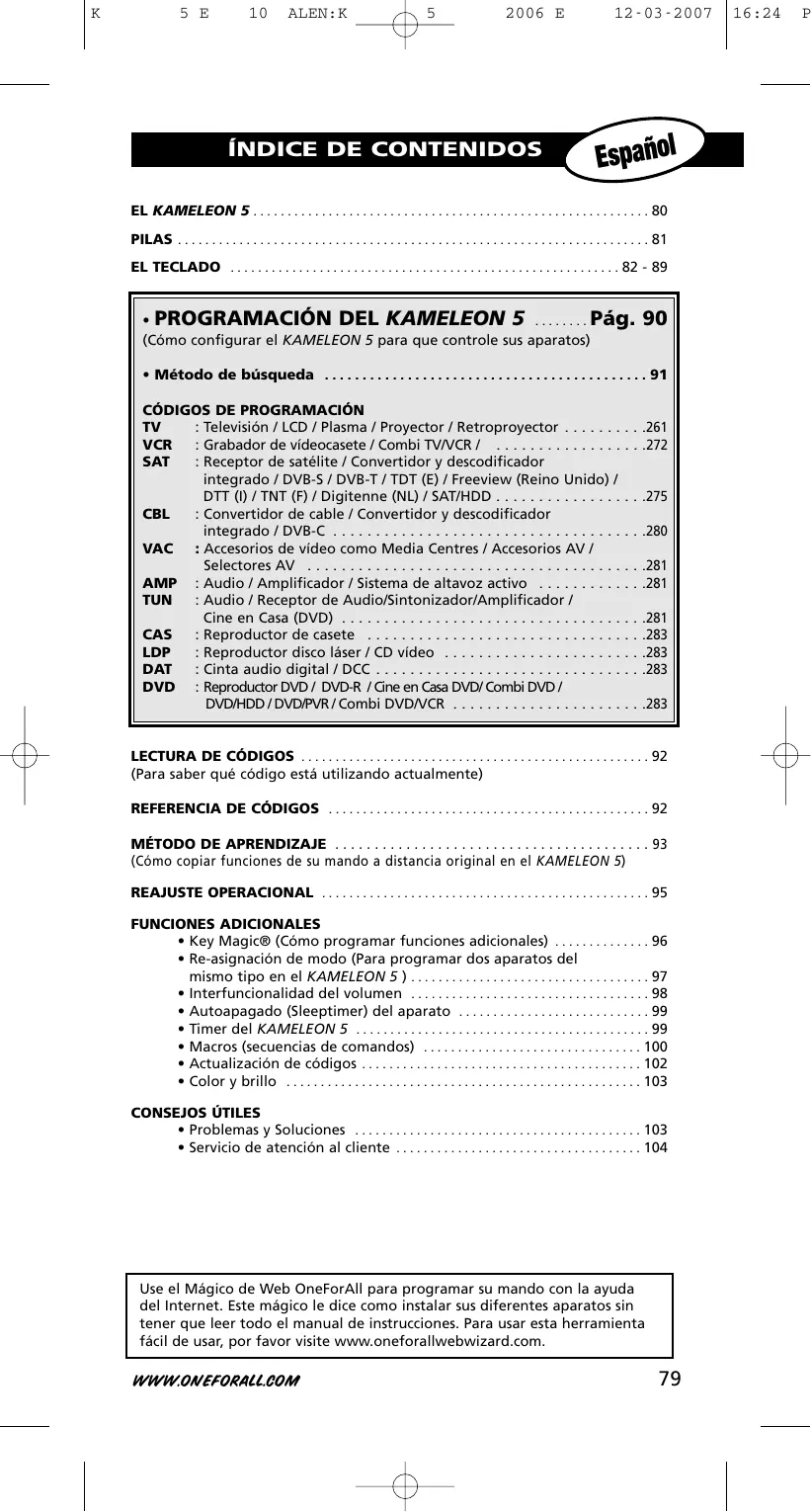 (Para saber qué código está utilizando actualmente) REFERENCIA DE CÓDIGOS . . . . . . . . . . . . . . . . . . . . . . . . . . . . . . . . . . . . . . . . . . . . . . . 92 MÉTODO DE APRENDIZAJE . . . . . . . . . . . . . . . . . . . . . . . . . . . . . . . . . . . . . . . . 93 (Cómo copiar funciones de su mando a distancia original en el KAMELEON 5) REAJUSTE OPERACIONAL . . . . . . . . . . . . . . . . . . . . . . . . . . . . . . . . . . . . . . . . . . . . . . . . 95 FUNCIONES ADICIONALES • Key Magic® (Cómo programar funciones adicionales) . . . . . . . . . . . . . . 96 • Re-asignación de modo (Para programar dos aparatos del mismo tipo en el KAMELEON 5 ) . . . . . . . . . . . . . . . . . . . . . . . . . . . . . . . . . . . 97 • Interfuncionalidad del volumen . . . . . . . . . . . . . . . . . . . . . . . . . . . . . . . . . . . 98 • Autoapagado (Sleeptimer) del aparato . . . . . . . . . . . . . . . . . . . . . . . . . . . . 99 • Timer del KAMELEON 5 . . . . . . . . . . . . . . . . . . . . . . . . . . . . . . . . . . . . . . . . . . . 99 • Macros (secuencias de comandos) . . . . . . . . . . . . . . . . . . . . . . . . . . . . . . . . 100 • Actualización de códigos . . . . . . . . . . . . . . . . . . . . . . . . . . . . . . . . . . . . . . . . . 102 • Color y brillo . . . . . . . . . . . . . . . . . . . . . . . . . . . . . . . . . . . . . . . . . . . . . . . . . . . . 103 CONSEJOS ÚTILES • Problemas y Soluciones . . . . . . . . . . . . . . . . . . . . . . . . . . . . . . . . . . . . . . . . . . 103 • Servicio de atención al cliente . . . . . . . . . . . . . . . . . . . . . . . . . . . . . . . . . . . . 104